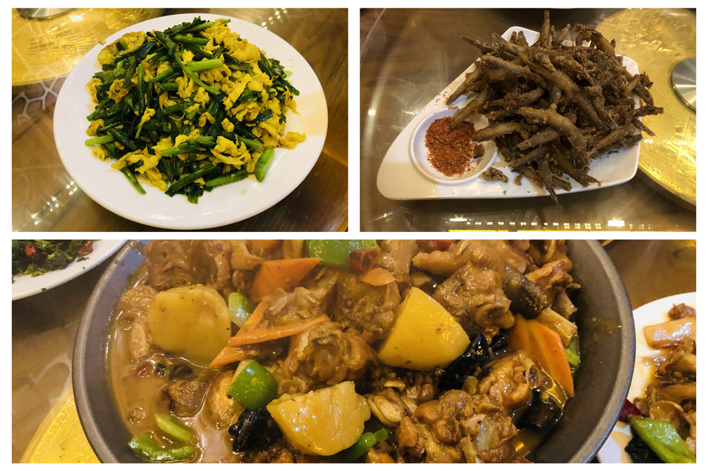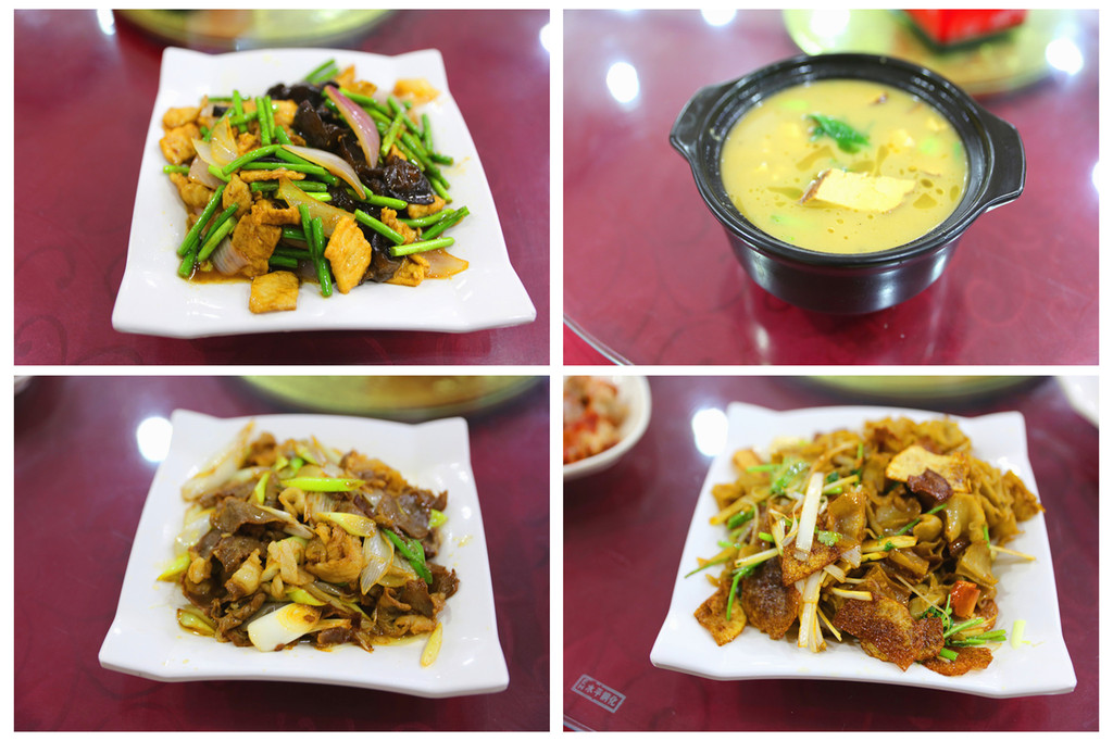 我们在南入口处,检票后开车入内,这里售票窗口和检票口是二十四小时营业,而且发现虽然入景区车流量较多,入景区车辆需排长队,但门票供应正常,入景区开行十多公里后才到达五台山景区核心区台怀镇附近,此时天色已全黑,车辆密集,道路开始拥堵,左冲右突,总算找到了我们预定的智者缘居客栈。这家客栈在台怀镇北面一偏僻处,老扳是一说话慢条斯理的当地人,很客气,客栈是刚修建不久,看上去挺整洁,我们订的是大炕房,这炕非常宽敞,感觉睡三四个人都够,因为天已不早,客栈不供应餐,老板介绍我们去不远处的一家餐厅,并叮嘱我们不要点所谓的野生台磨之类的东西,不实在且贵,一下子对客栈的好感提升了许多。听了老板的话,我们去了推茬的交通宾馆餐厅点了一些家常菜,其中有山西菜中最普通的过油肉,这道看起来有点像鲁菜里的木须肉,食材用的是猪肉里脊,加笋、木耳、大葱、姜蒜等一起炒,最后淋猪油出锅,这道菜看似简单,实际上别有风味,是一道下饭好菜,而炒栲栳栳”是用莜面做的一种面食,加牛肉丁、香菇、木耳,又当菜又可当主食,味道还不错。