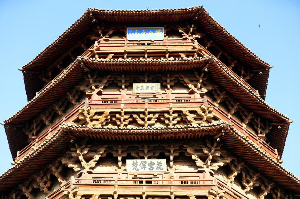山西是文物大省,被誉为古代建筑博物馆,现存古建筑数量居全国之首,其中宋代以前古建筑占全国总数的70%以上,应县木塔是其中之一。应县木塔正式名全称佛宫寺释迦塔,建于辽清宁二年(公元1056年),是中国现存高度最高、年代最老的一座木构塔式建筑,走进大树婆娑、铁狮护卫的木塔院门,很有点历史的沧桑感,塔建造在四米高的台基上,塔基分作上下两层,下层为方形,上层为八角形,塔高9层,5个明层,4个暗层,外观为5层6檐,不细看感觉不到它的倾斜,应县木塔之所以历经千年风霜而屹然不动,与其建筑结构有直接的关系。木塔以卯榫结合,刚柔相济,耗能减震作用十分明显。上世纪三十年代当地人误认为塔身明层原有的墙体对木塔载荷过大,于是统统拆掉,换上了门窗,也就是现在的样子,但实际上门窗对柱子的稳定性不再有帮扶作用,改变了曾经连为一体的柱网结构,也为后来塔身的倾斜埋下了隐患,因此虽然我们在近距离发现不了木塔有倾斜,但据报道显示,目前应县木塔的倾斜最大倾角已达11.3°,为保护文物,目前木塔已不允许登塔,只能在外面看塔了,我们在塔外转悠一圈,对于这纯木打造的宝塔,感叹不已,应县木塔的塔上和门楼上的50多块珍贵的匾牌都是历代知名人士所提,更有甚者在塔上居然还有明代两位皇帝亲自题写的匾额,足见木塔在历史上的地位,在塔基上北望,那里就是佛宫寺的后院,均为明清时所建,一座砖桥把两个院落连接起来,里边是佛的世界,而佛宫寺的更北面还在大兴土木建造不知做什么的建筑,真希望不要把木塔周边原有的布局破坏了。