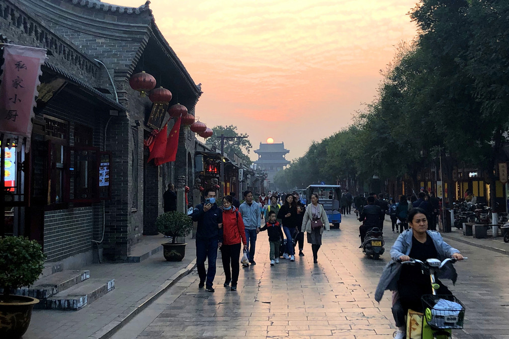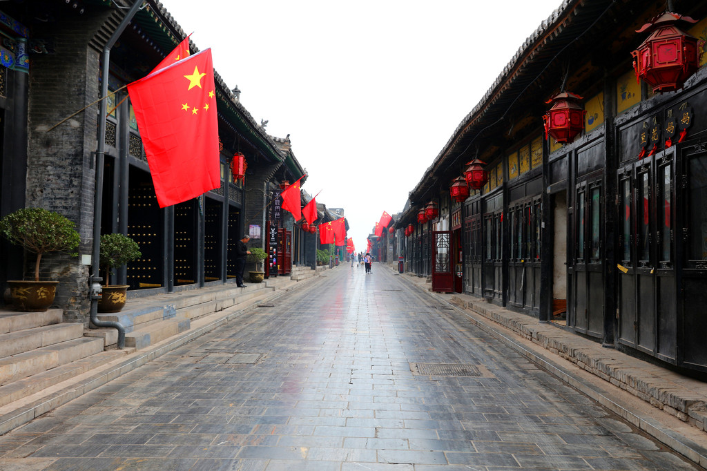 我们选择一大早便出门,此时的平遥古城安静地沐浴在和煦的霞光里,显露出真正的古城模样,周围的一切都是那样的平和、安详、没有喧闹,一如远去的历史重现,日常大街上人声鼎沸、摩肩接踵的景点,现在大门紧闭,空无一人,在一小巷深处吃过了早餐后,我们再次漫步游人无几的南大街明清街,南大街明清一条街是平遥最热闹的地方,此刻街道静悄悄的,两侧明清风格的建筑均是古色古香,票号、钱庄、当铺无一不有,每个体面门厅的花岗岩门槛上,都有两道很深的车辙印痕在告诉人们当年街市的繁华。