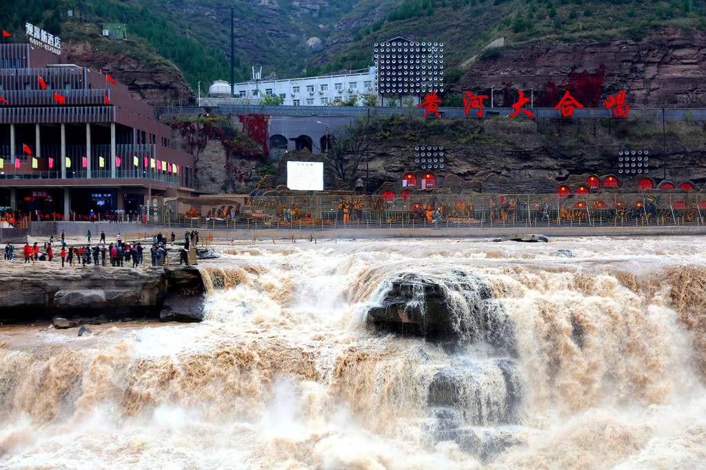 今年黄河流域发大水,8月份黄河洪峰曾使山西这边景区关闭,此时虽然洪峰已过,景区烣复开放,但仍有一大片水淹没,景区也用栏杆围住,游人不能过去,当我们终于站到瀑布前,被眼前排山倒海的磅礴气势所震憾,眼前滔滔黄水倾泻而下,激流澎湃,浊浪翻滚,水沫飞溅,烟雾迷濛,狂涛怒吼,而对岸的陕西宜川县一边高挂一幅巨大的国旗,并播放着雄壮有力的<<黄河大合唱>>,看着此景,让我们也热血沸腾,情绪激动,万丈狂澜,今年的黄河因为水量大,无论是壶口瀑布的主瀑布还是侧瀑布都是惊涛骇浪、万马奔腾,但也正因为水势大,却影响了瀑布的落差,在壶口瀑布壶嘴得正当中,有一块油光闪亮得奇石,人称“龟石”,现在就只是露出那么一点点,不过这又给壶口瀑布增添了几分神秘色彩。