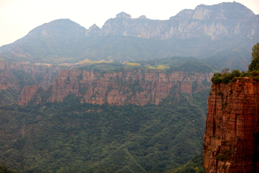 离开郭亮村一看才上午十点,趁自驾车已开进景区,决定自由自在地在万仙山景区内开车随意走走,看指示牌我们后向丹分沟方向驶去,这里公路陡峭多弯, 两侧雄壁伟岸,波澜壮阔,天际线上奇石遍布,形态各异。北方山景的气势的确与南方不同,隔着前方深谷沟壑,只见远处右、中侧两座山峰耸立,气势非凡,颇为壮观,山体上下部分是大段的绝壁断崖,中间又横亘着两层绿带,我们停车在路边一观景台上眺望,一幅辽阔雄奇的南太行长卷展现在面前,隔着宽大的峡谷,对面群山或层层叠叠,或乱峰耸天,宏观壮观,大气磅礴。