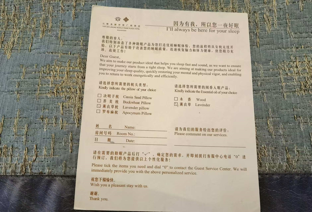 酒店为客人提供了不同品种的枕头。客房还提供开夜床服务。