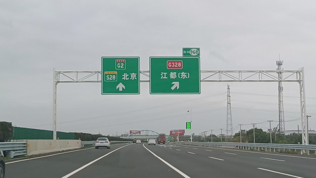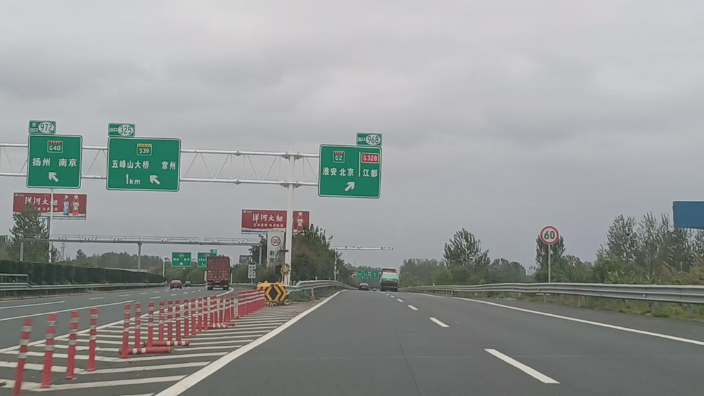 由扬州江都往北的京沪高速单向四车道,限速120公里/小时,车流不多。