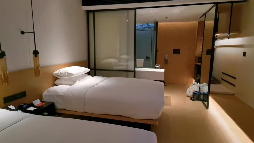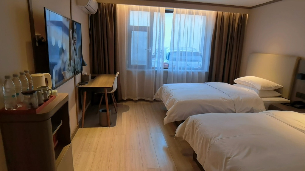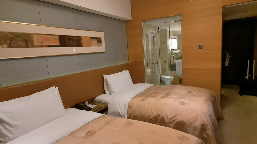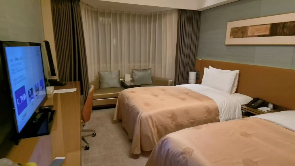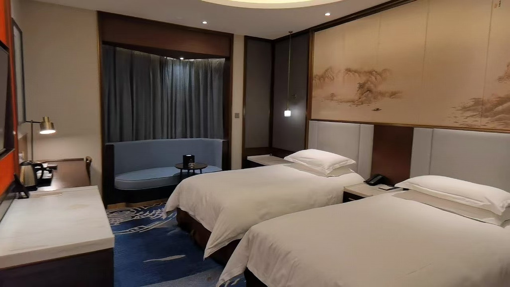 酒店前台给免费升级,实际入住的是豪华双床房,楼层更高,客房装饰更豪华。