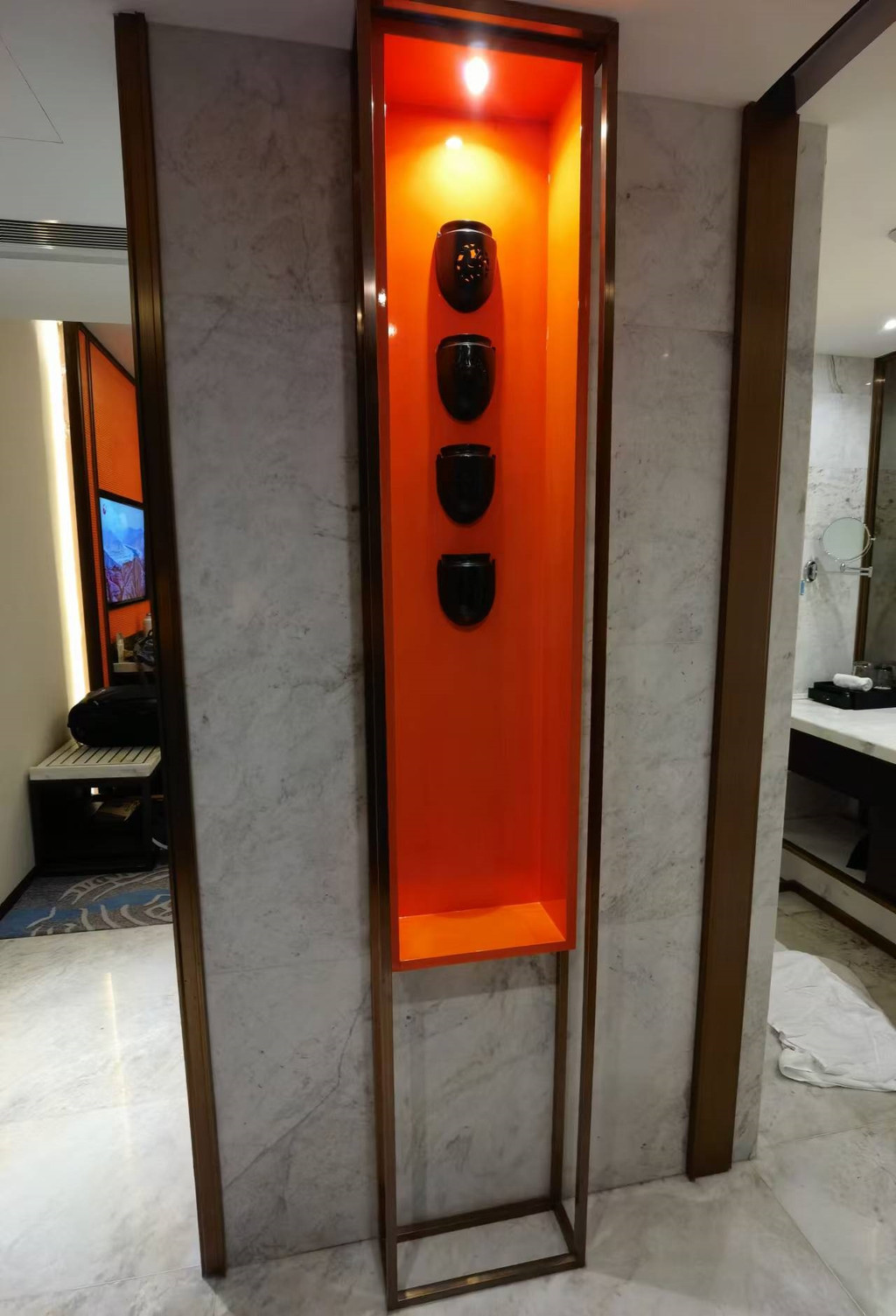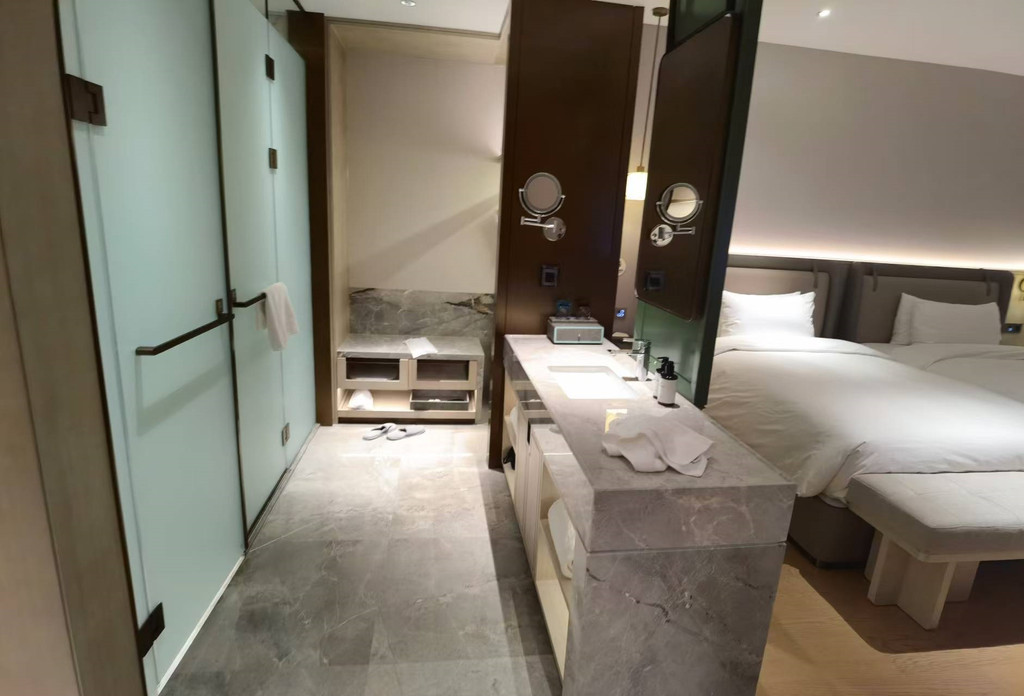客房内,把淋浴室设在中间位置,卫生间有两处可进入。