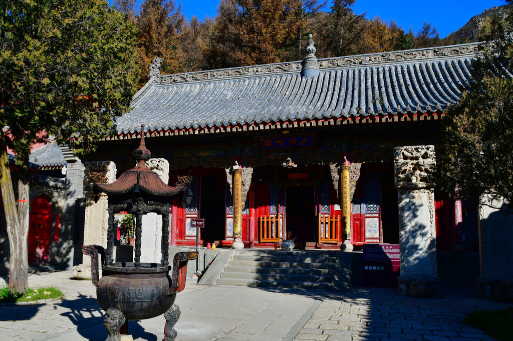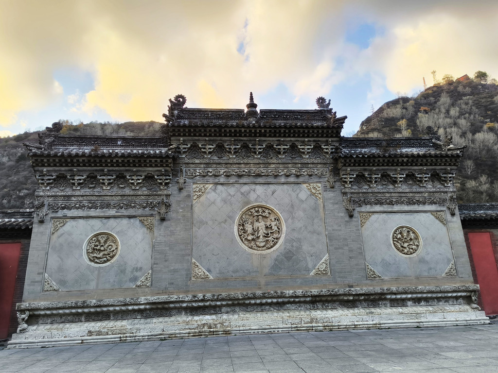 20241023,天气晴朗,第一个景点是龙泉寺。龙泉寺位于五台山台怀镇南5公里九龙岗山腰,故又俗名九龙岗。龙泉寺原为杨家龙泉寺将家庙,寺旁有泉曰龙泉,寺由此而得名。 始建于宋代,民国初期重建,占地15950平方米,殿堂僧舍165间。现存影壁,台级,牌坊和三座院落。龙泉寺之最:石雕建筑最多、最繁、最佳。寺中有三件艺术瑰宝:影壁、牌坊、墓塔。(免门票)