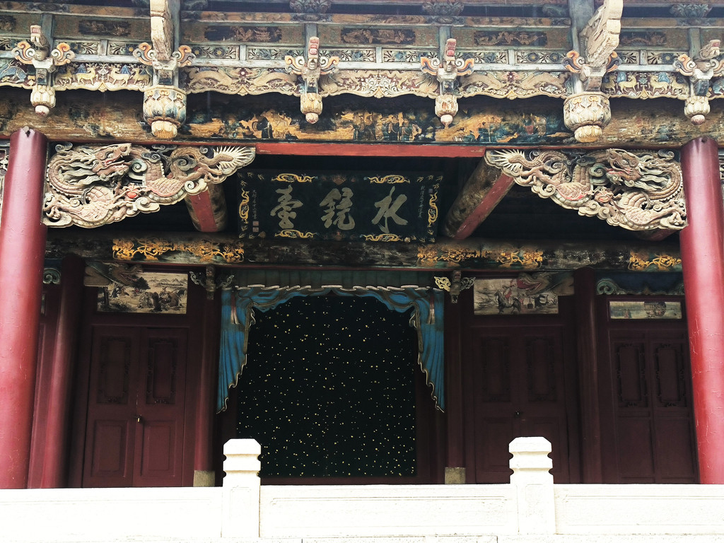 水镜台创建年代不详,明万历元年(1573)、清道光二十四年(1844)重修,集中体现了中国古代建筑殿、台、楼、阁四种风格,前部为单檐棚顶,后部是重檐歇山顶,是古时酬神演戏的戏台。戏台正中央悬挂“水镜台”匾是清乾隆年间翰林院编修晋祠人杨二酉所书,为晋祠三大名匾之一,被誉为"秀丽之笔“。