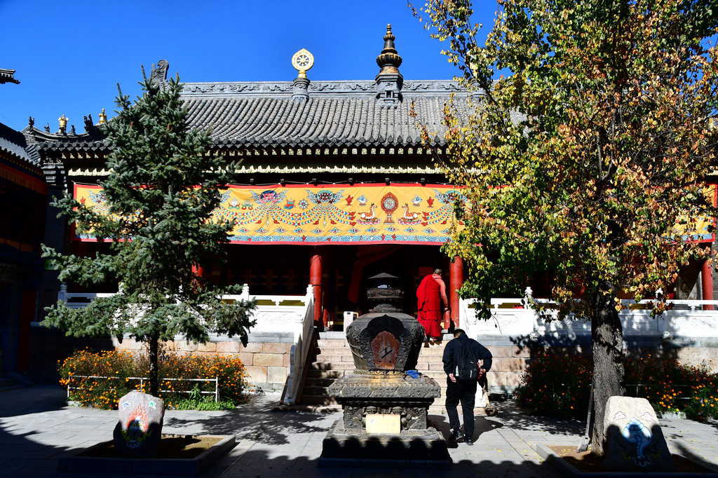20241022,天气晴朗,中午来到菩萨顶,菩萨顶位于山西省五台山台怀镇的灵鹫峰上,海拔1797米,是五台山十座黄庙(喇嘛庙)中的首庙。萨顶是满族语言的叫法,意思是文殊菩萨居住的地方,又名大文殊寺,是五台山著名的五大禅处之一。菩萨顶现在占地面积45亩,有殿堂僧舍等大小房屋430多间,布局结构紧凑而有变化。现存建筑多建于清代,建筑形制、手法及雕刻艺术,多参照皇宫。这里是每年农历六月初四到六月十五的黄教法会主场地,游客可以看到喇嘛们“镇魔”的盛况。(进入菩萨顶要购门票,全票价10元,60岁以上免票)