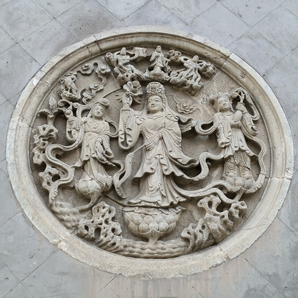 普化寺的照壁用石与砖砌成,是五台山寺院中最长的照壁,正中嵌石刻“福禄寿三星”图案,两边是“文五别子”和“番溪求贤”,背面雕有观音、善财和龙女,并有花草作陪衬。这些石雕十分出色,可与龙泉寺照壁相婢美,是五台山砖石建筑中的杰作之一。