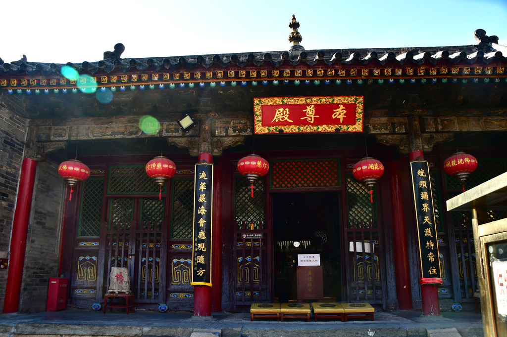 五台山普化寺,位于山西省五台山台怀镇南里许的东山脚下,背靠青山,面临清水河,环境清幽怡人。普化寺是五台山上建造较晚的一座寺院,创建于明代,原称帝释宫,清代改建为玉皇庙,供奉玉皇大帝,为五台山唯一的道宫。从民国十一年(1922年)始,大兴土木,重建庙宇,改建成了儒、佛、道合一的寺院,并且名为普化寺。寺院占地1.89万平方米,中轴线上有天王殿、大雄宝殿、三佛殿和卧佛殿四座大殿。中轴线左右各有两进跨院,整体呈凤凰展翅的格局。是一座以砖雕艺术为特色并具有园林风格的寺院。装饰精雕细刻,彩绘华贵艳丽,为民国年间的建筑风格,又具有鲜明的道教色彩。(免门票)