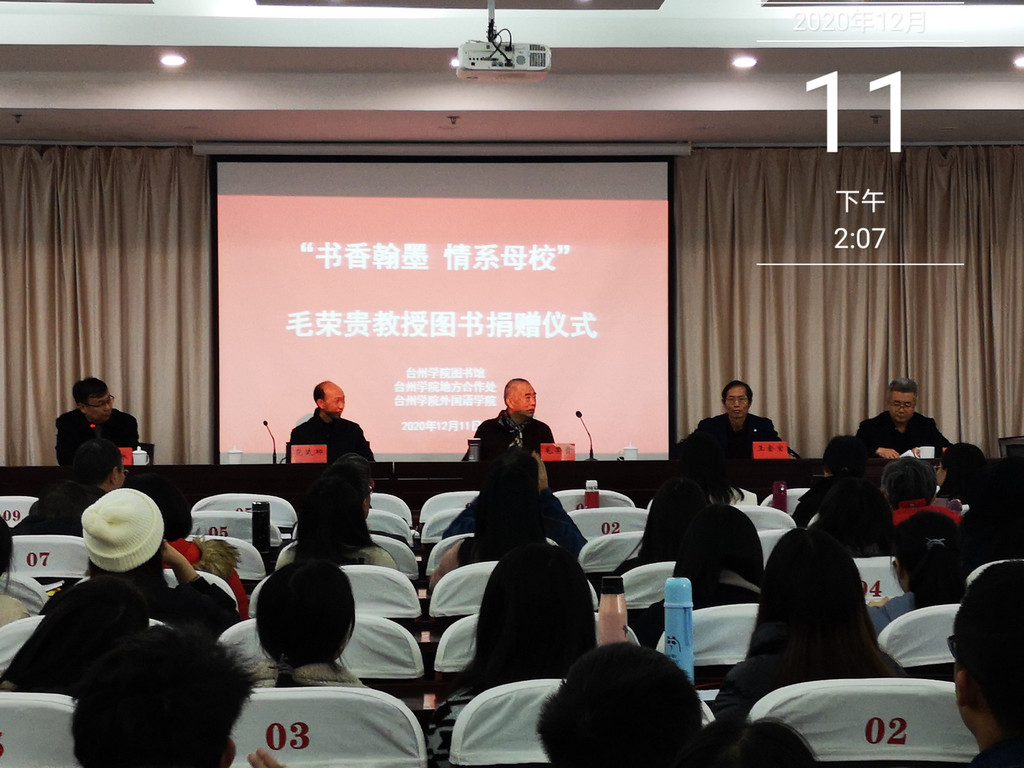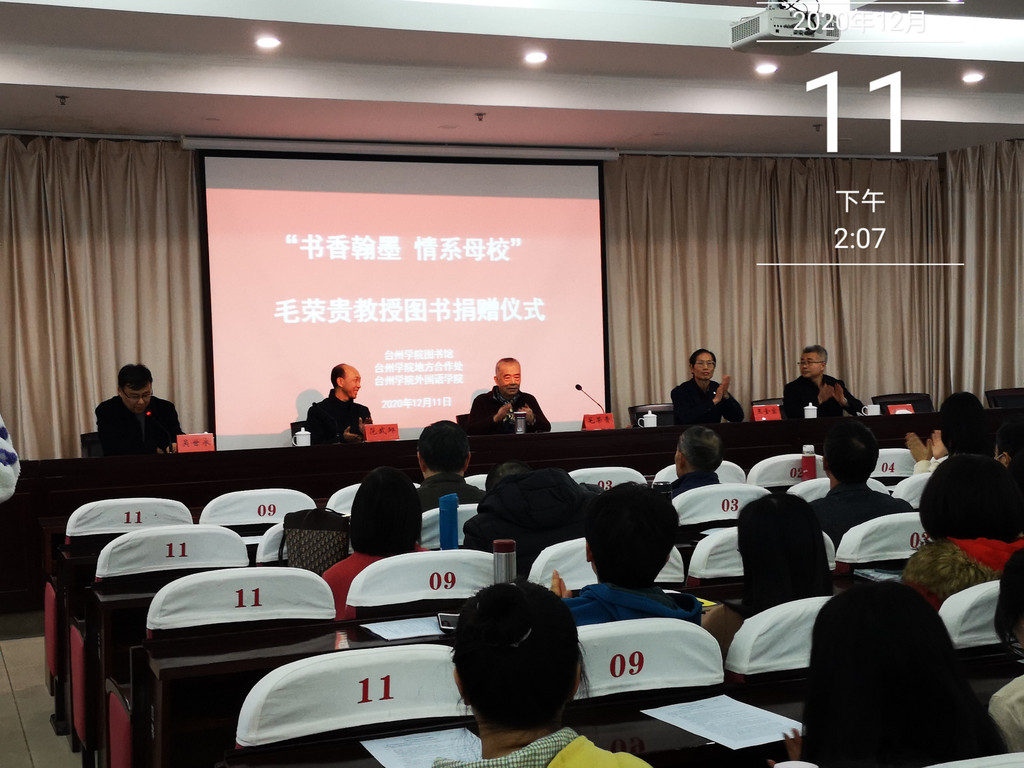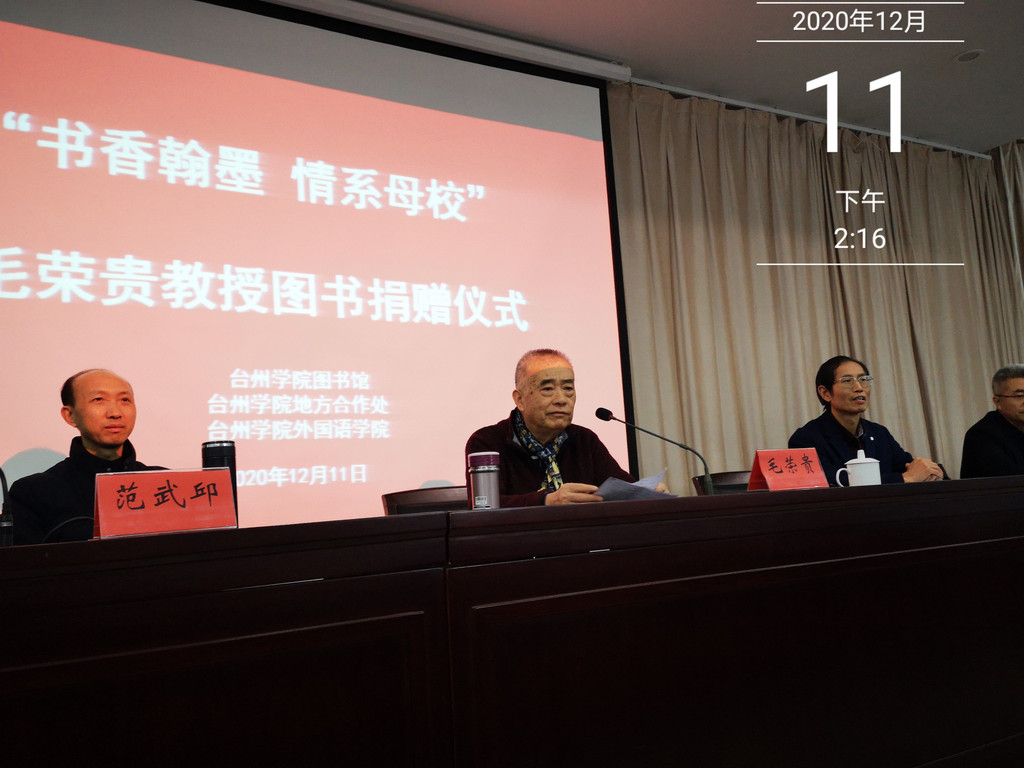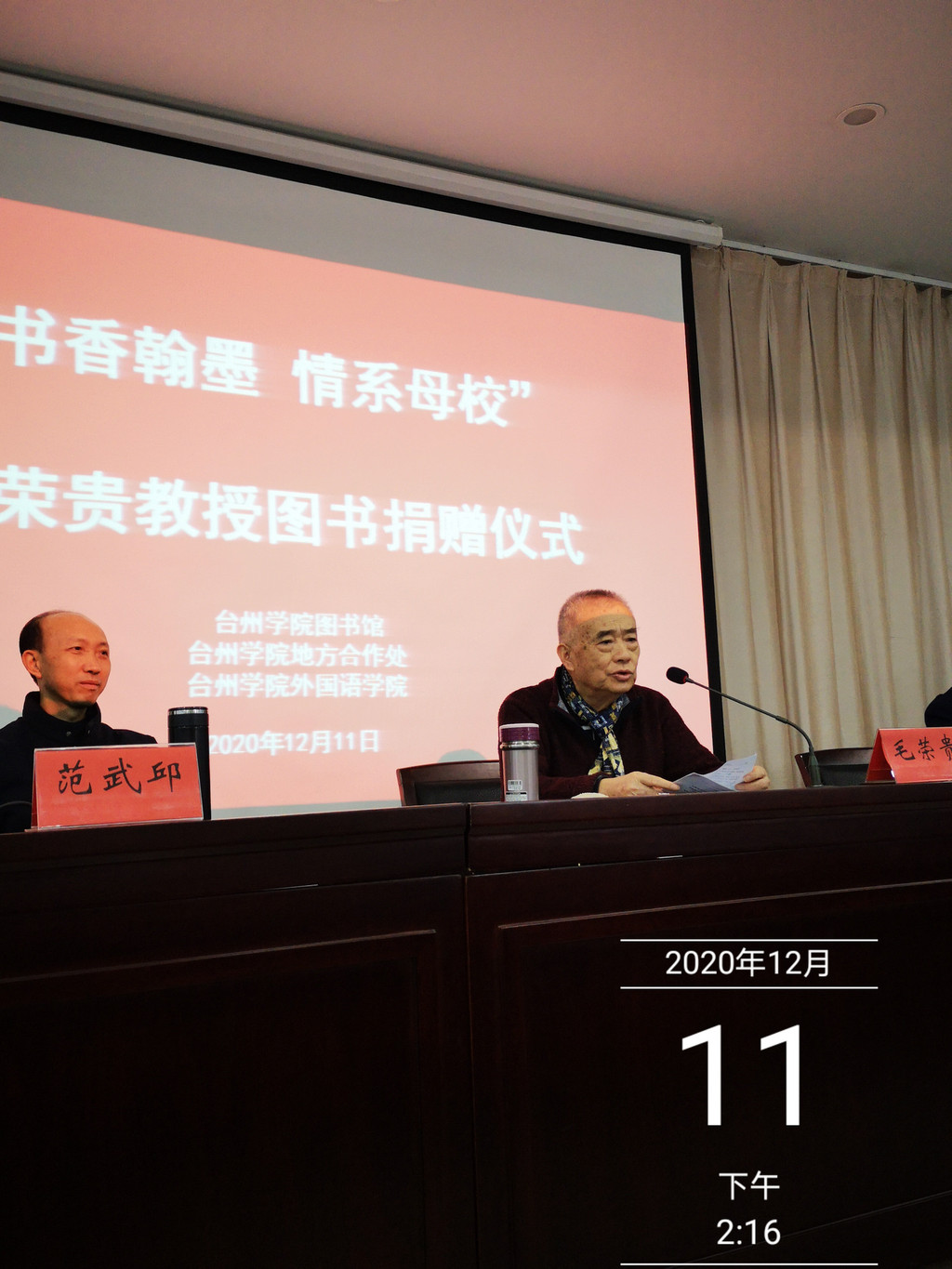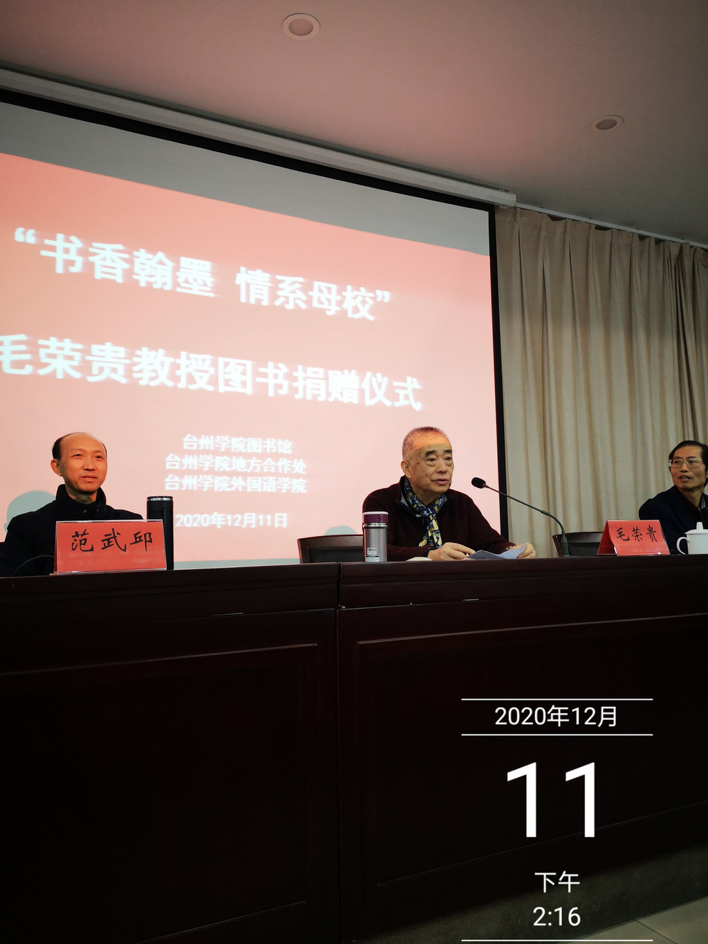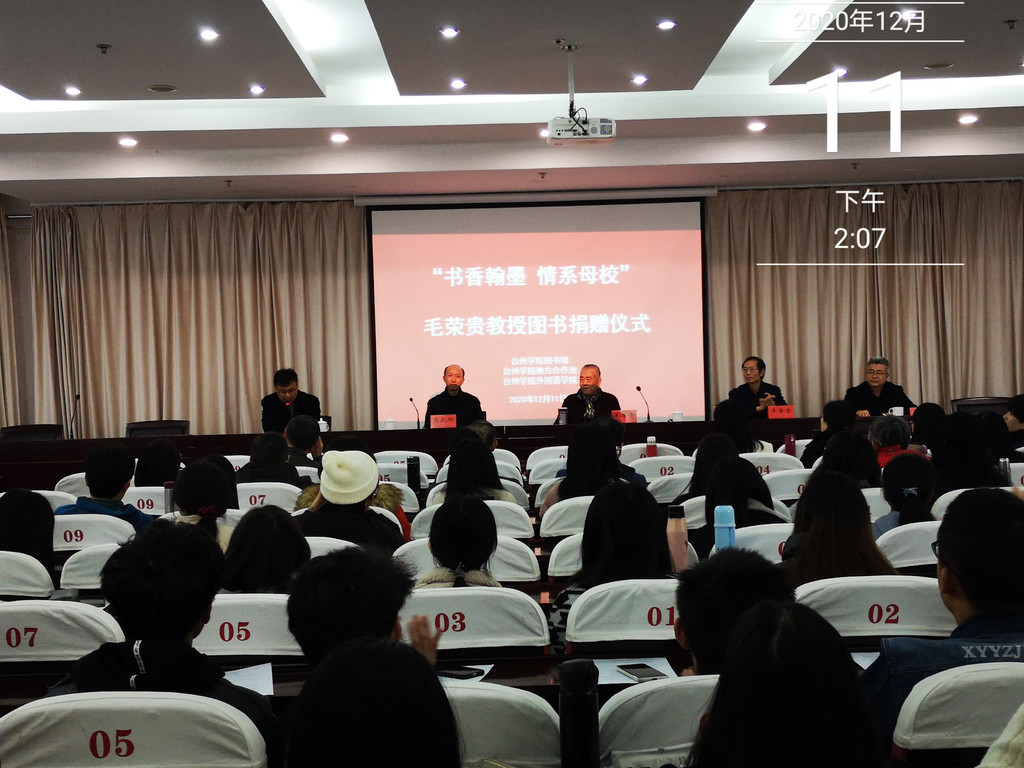 12月11日,在台州学院图书馆报告厅,举办赠书仪式。校教育发展基金会,校图书馆领导出席,学院施书记主持并讲话(院长因故未到场)。