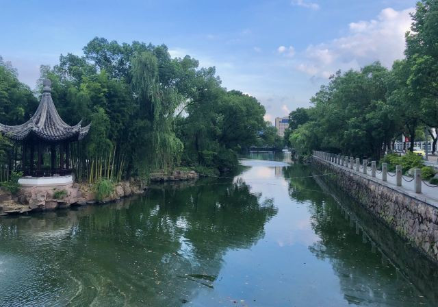 东湖位于临海古城的东侧,开凿于北宋年间。东湖公园背山面水,三面青山环抱。园内亭台水榭、波光绰影,“山绕平湖波撼城,湖光倒影浸山青”,清新灵秀、依山傍水的景致让人恍惚间进入诗情画意之中。难怪清国学大家俞樾将其同杭州西湖相媲美:“杭州有西湖,台州有东湖,东湖之胜,小西湖也。”若是在夜里游览,湖光月影两相合,钟灵毓秀、物产丰饶的江南水乡恰如一个温婉的女子,微风轻抚、幽静神秘,颇是另一番光景。