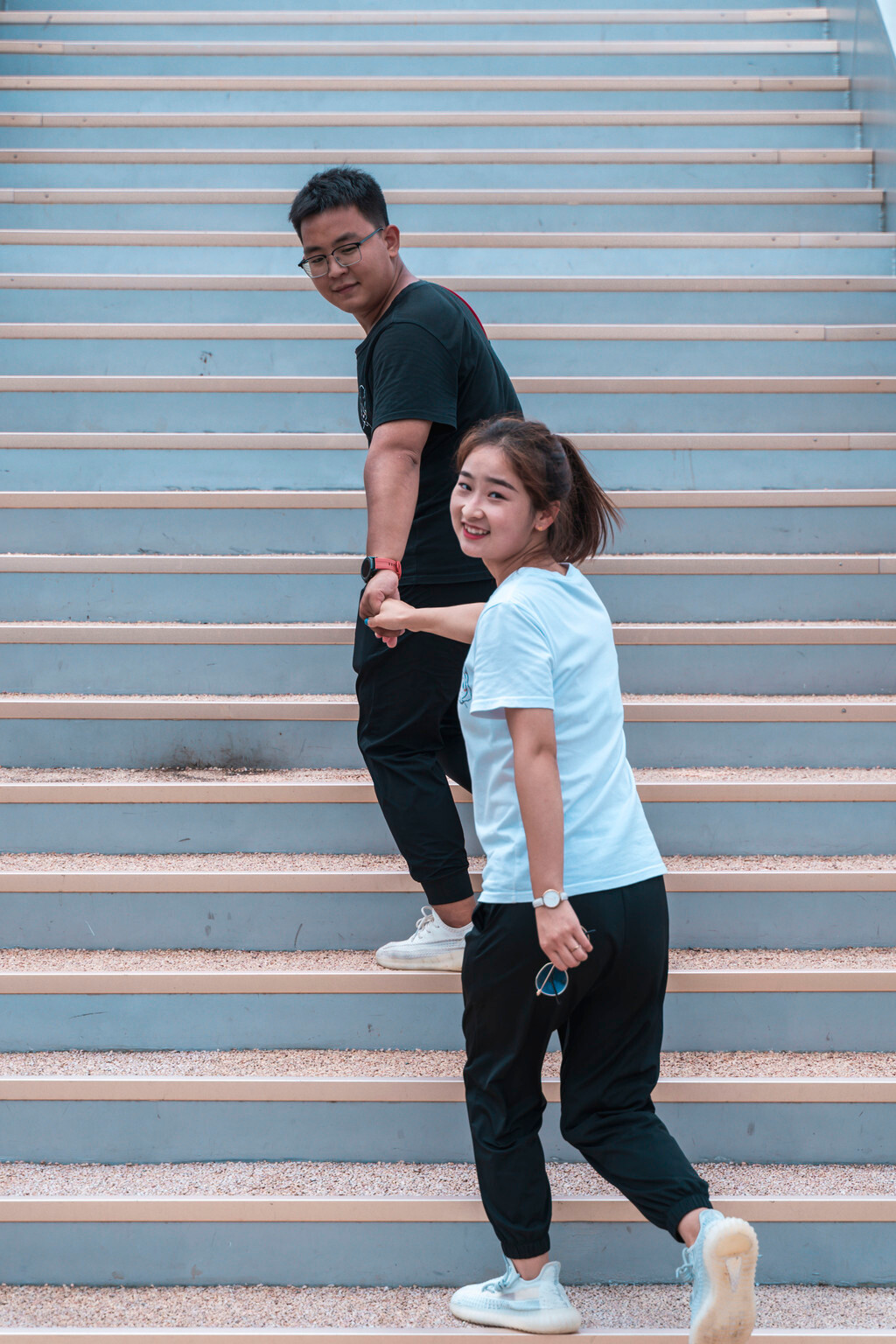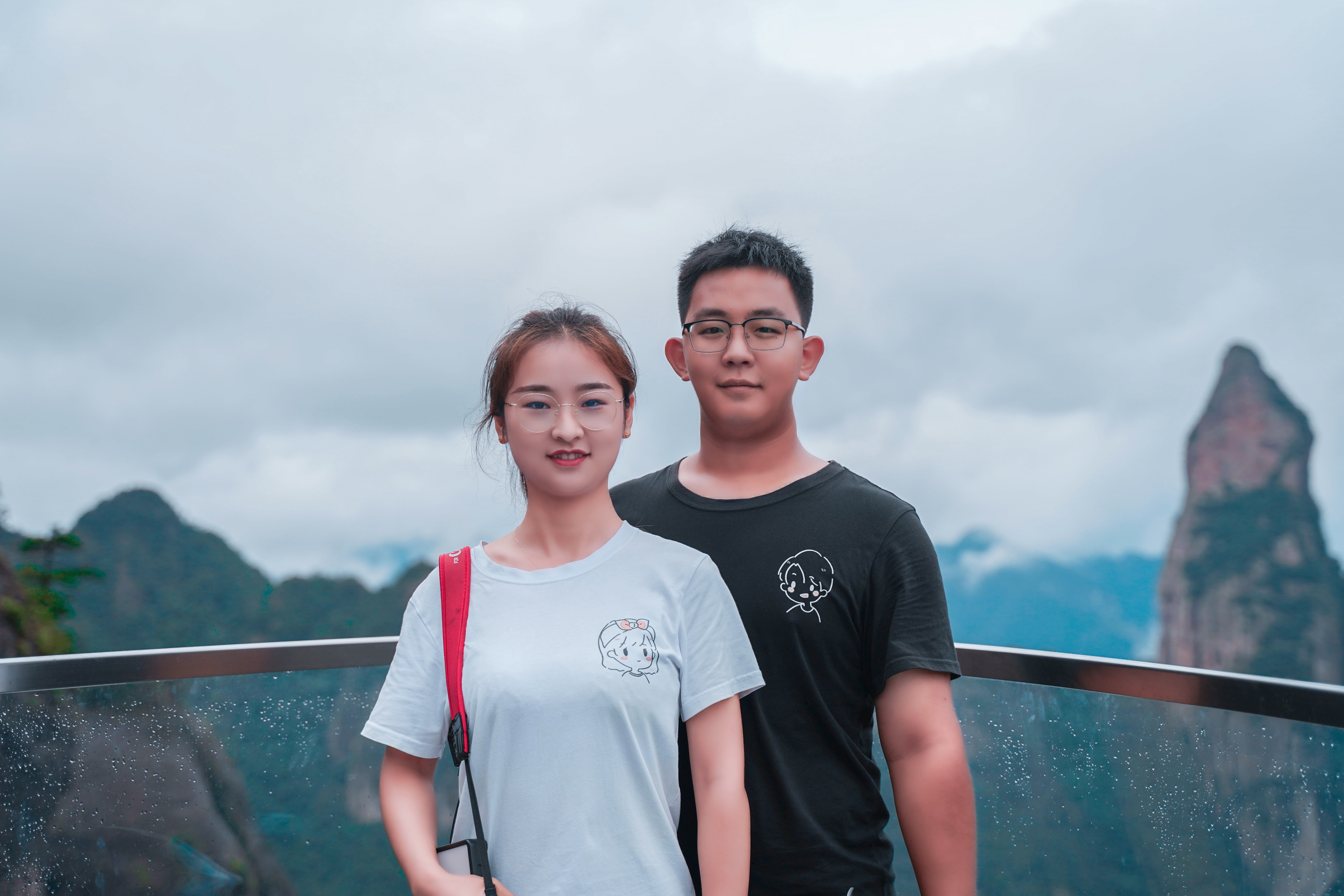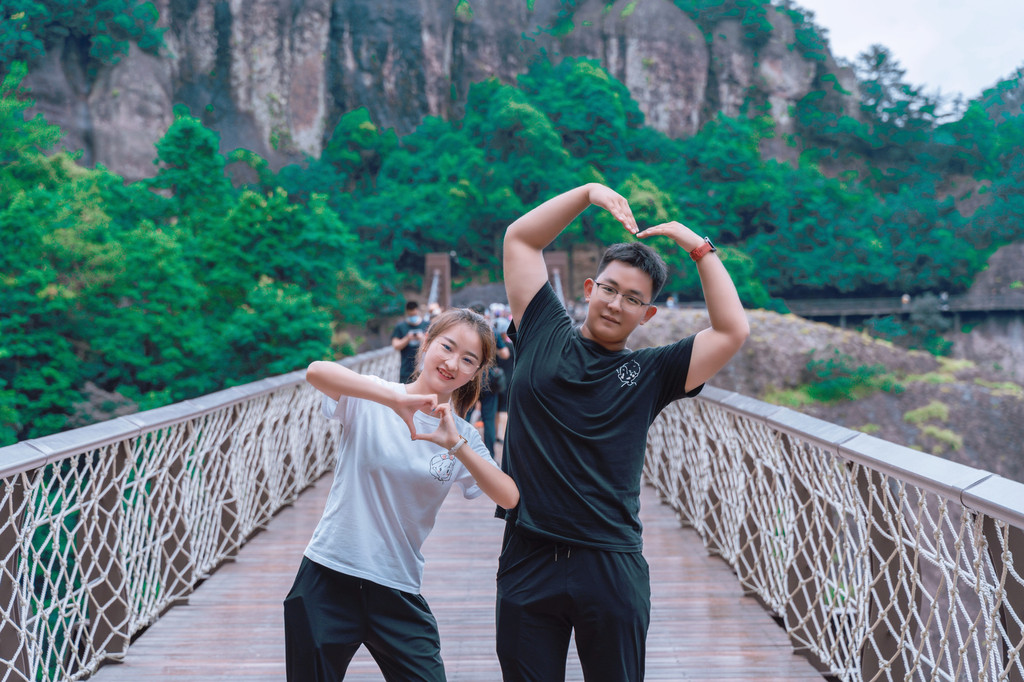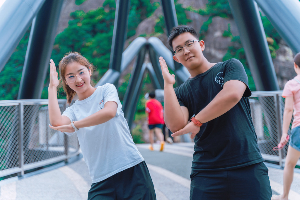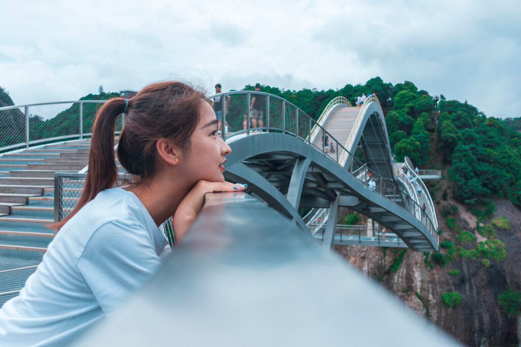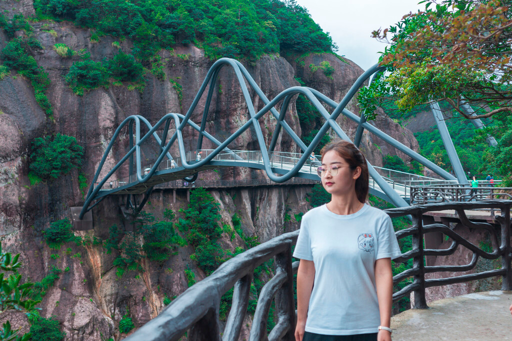 整个桥身,为弧形钢桁架结构,桥长87米,宽4-6米,悬空高120米,站在桥上可以俯瞰两边的风景,而我和依依同学也在这里留下了一张非常现代化且非常搞怪的合照,在这座非常山地且立体的桥上,只要找好角度,真的很好出片。