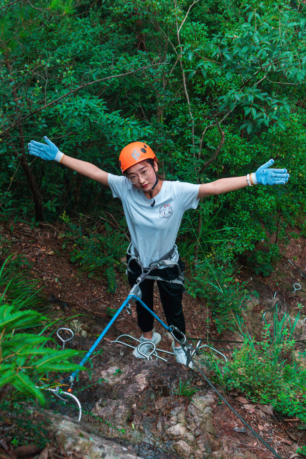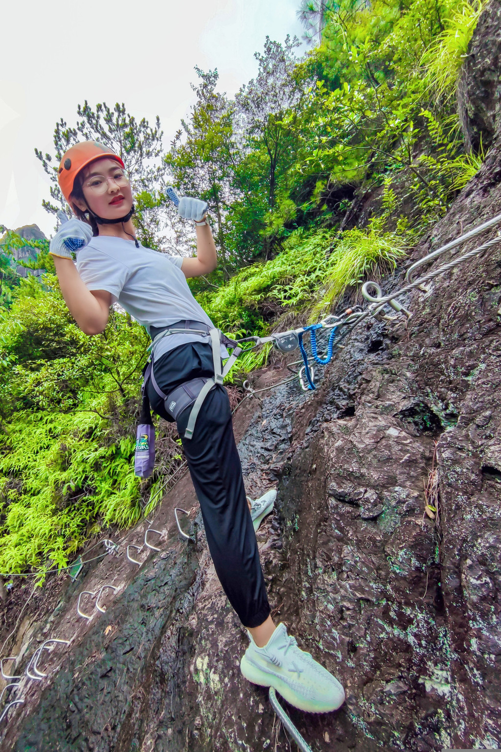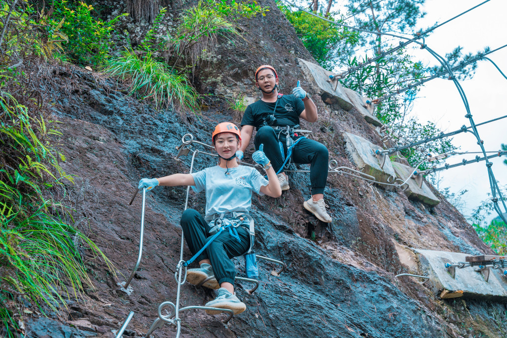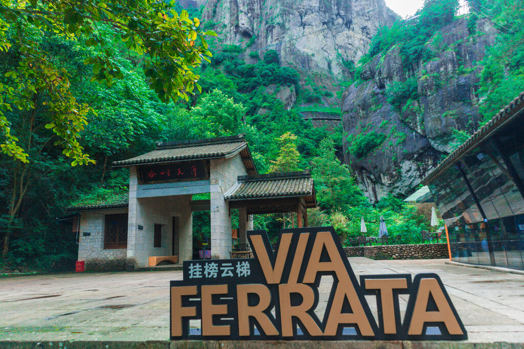 所以这次神仙居之旅,神仙居的飞拉达,祥哥我自然必不会错过。在这里再次为大家科普一下飞拉达这项运动,飞拉达是意大利文(Via Ferrata,意为岩壁探险或铁道式攀登)的音译,指的是在山体岩壁上建设,由钢扶手、脚踏、生命钢缆等构成的攀登径道,让不具备攀岩能力的人也能攀上陡峭的岩壁。