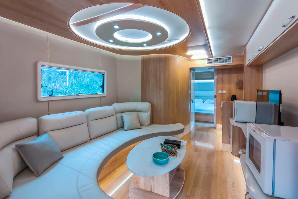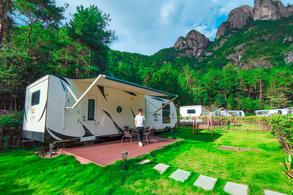 如果不想住在常规的房间里,酒店还有配套的房车和房车营地,房车空间真的超级大,一辆房车可以住得下一组家庭,而且私属空间相对更大,给人的体验感更好。而且每辆房车都有一个自己的独立小院儿,站在小院里,就能领略到整个房车营地和神仙居景区美景的完美融入,说这里是世外桃源,我觉得都不过分,真的太惬意了!
