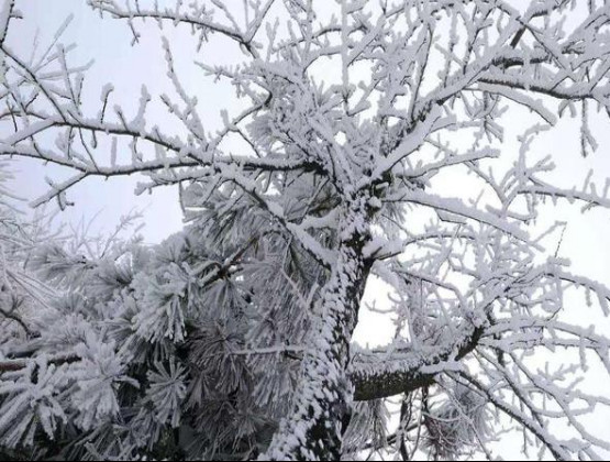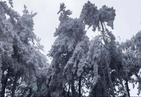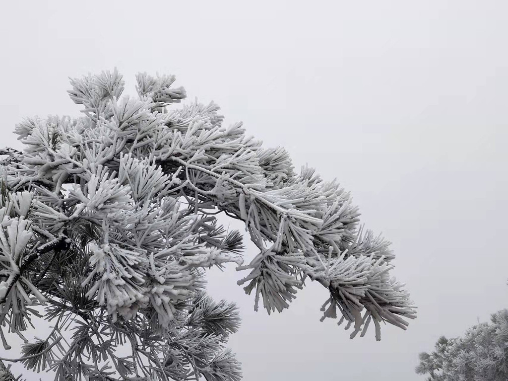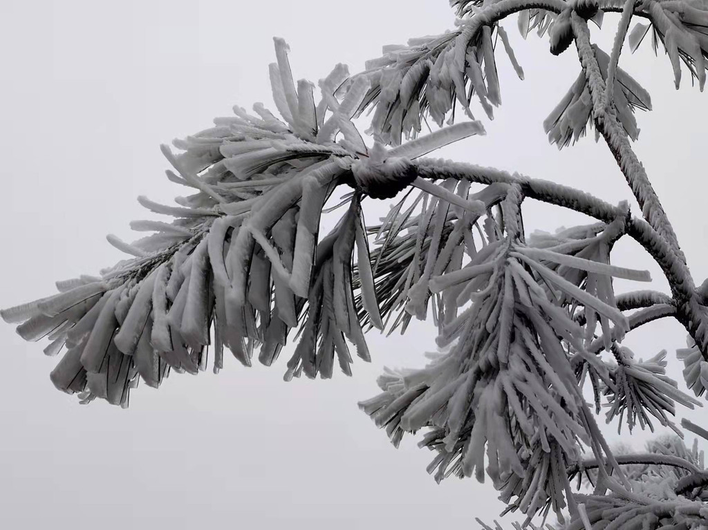 漫山的松树宛若玉枝垂挂,簇簇松针恰似银菊怒放,晶莹多姿。满树满枝的冰挂、雾凇、雨凇,犹如珠帘长垂,遍布峰体,风吹树动,冰挂撞击,万籁有声,仿佛一曲曲动听的音乐,和谐有节,清脆悦耳。偶尔间,一丝的阳光略过,苍茫的林海更显耀眼。