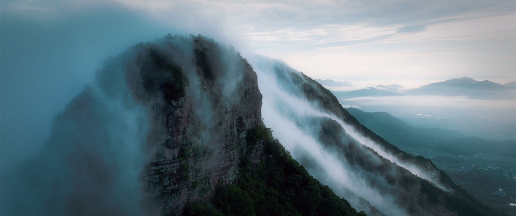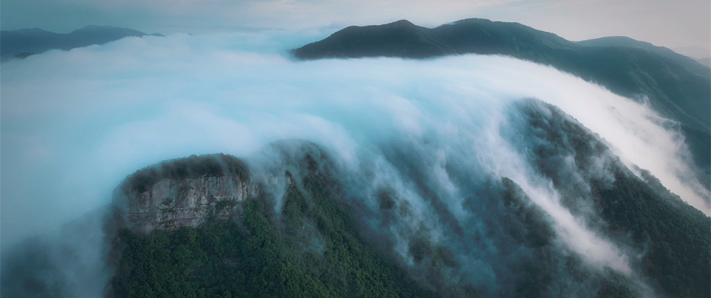 沿步道一路前行,绿树成荫,凉风习习,鸟语花香。行至视野开阔处,竹海茫茫,流云涌动,云雾缭绕,云海与峻岭险峰相互交织,于山间奔流,犹如滔滔江海,连绵不绝,气势磅礴。云海之间的狮子岩若隐若现,被遮掩的山体仿佛海上孤岛,虚虚实实,幽邃、神秘、玄妙,宛若人间仙境。