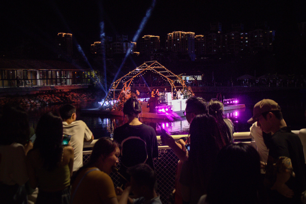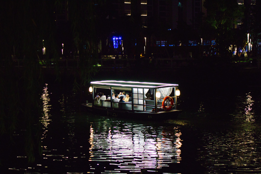 微风阵阵,波光粼粼,伴随着一首首耳熟能详的流行音乐在水上舞台响起,越来越多市民集聚河边,在酣畅淋漓的律动中,或是观赏,或是跟着哼唱,还有的举起手机,记录下夜游时的惊喜一刻。