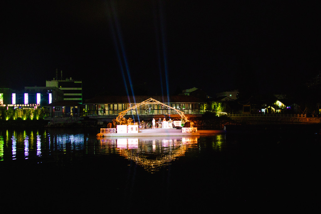 华灯初上,漫步浙江省台州市黄岩区官河古道,水上舞台音乐会现场歌声阵阵,悠扬激昂,让人心潮澎湃,游客感受到别样体验。8月16—17日,“嘻嘻”户外生活节正在这里举办,沉浸式的“一座甜了千年的城”主题夜游通过“行进式夜游+沉浸式演艺”的新体验,让游客尽享黄岩之夜的文化盛宴。