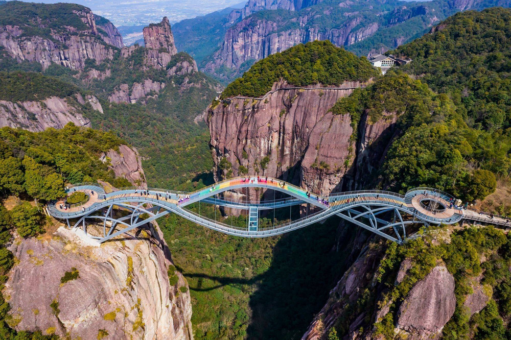 来神仙居游玩,没有人会错过如意桥。桥身的彩虹色和“玉如意”造型成就了这座桥的高颜值。从高空俯瞰,整个桥体如悬于空中的玉如意,又似仙女的彩锻,诗意而浪漫。