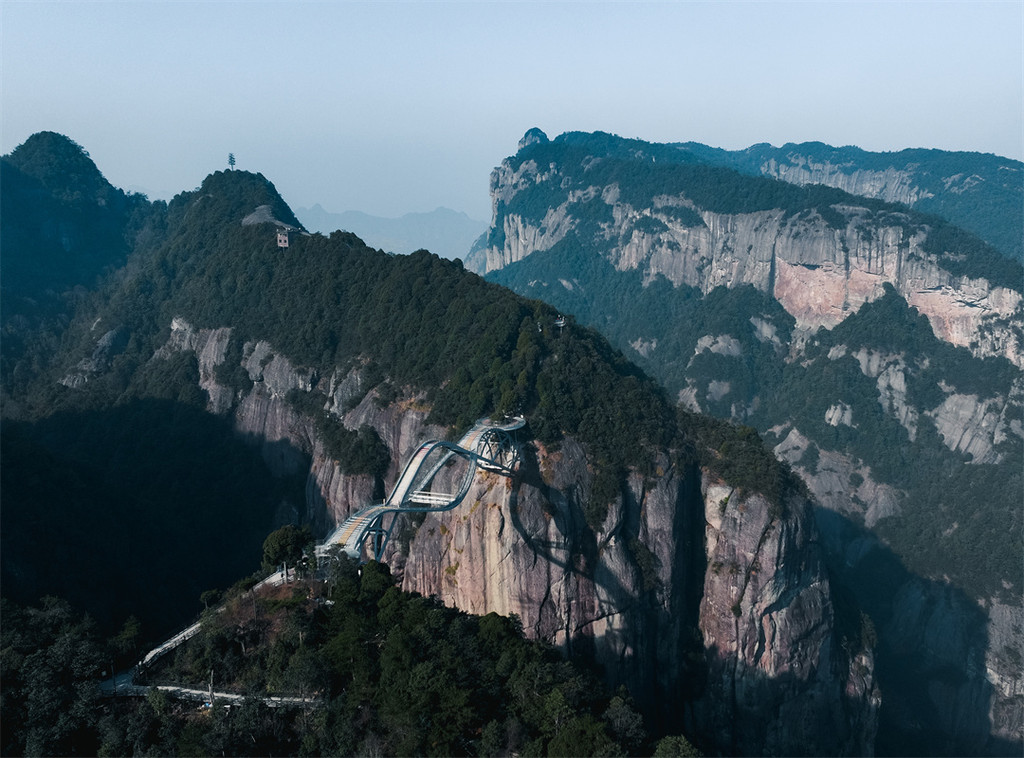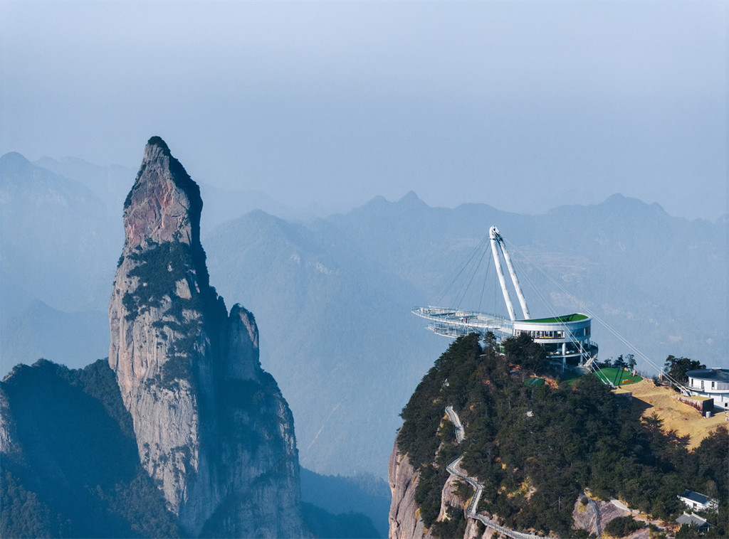 南天顶:悬空架在悬崖峭壁上的飞船形状的巨型观景台,悬挑45米。都是透明玻璃设计,非常刺激。二层有少许非透明玻璃,想挑战自己极限的可以卡边走,真是无比刺ji的挑战。