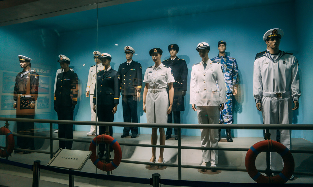 展馆里,还看见了很多穿着海军制服的模特展示。