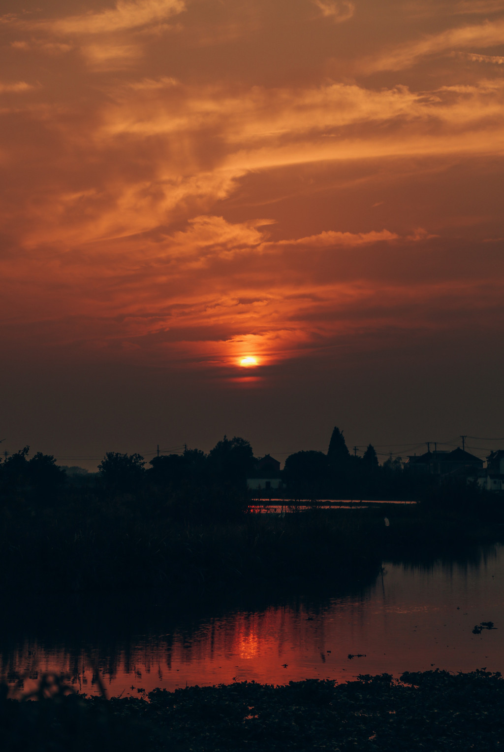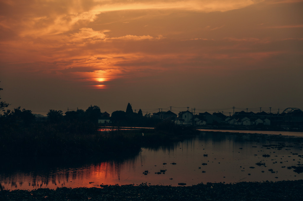 太阳在云层中若隐若现,湖面呈现着落日的倒影,其余的一切都模糊成了影子。