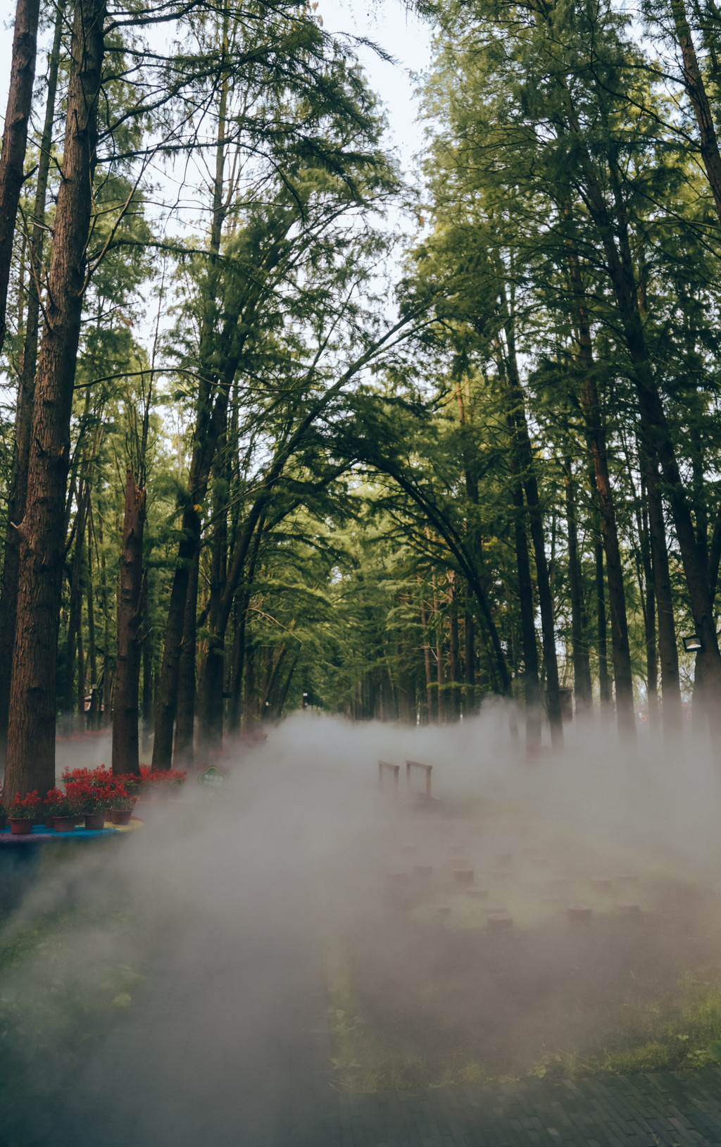 水雾渐渐弥漫起来,慢慢遮住了道路,遮住了树根处,身处其中,恍若仙境。