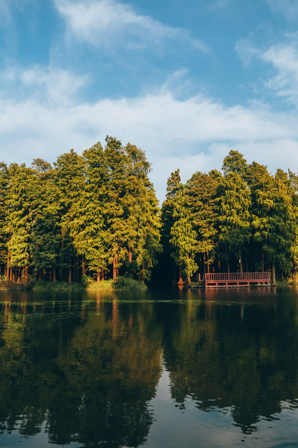 这个时间,阳光开始温柔,杉树呈现出暖黄色,天边也有了色彩,这林中有水,水中有树的场景,也被人们誉为“小九寨”。