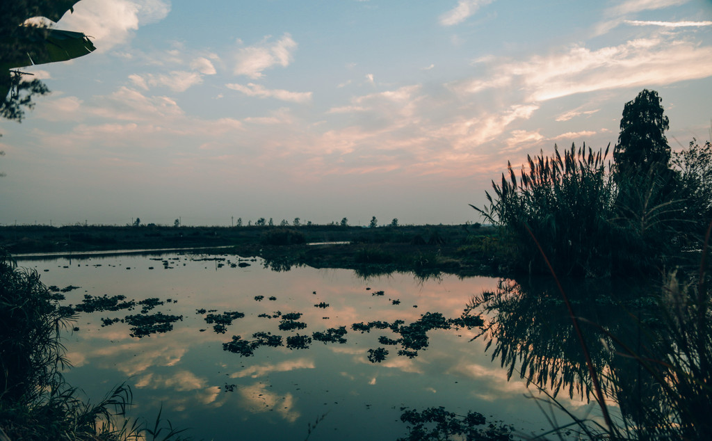 水面倒影着蓝天白云和晚霞,平静如镜。
