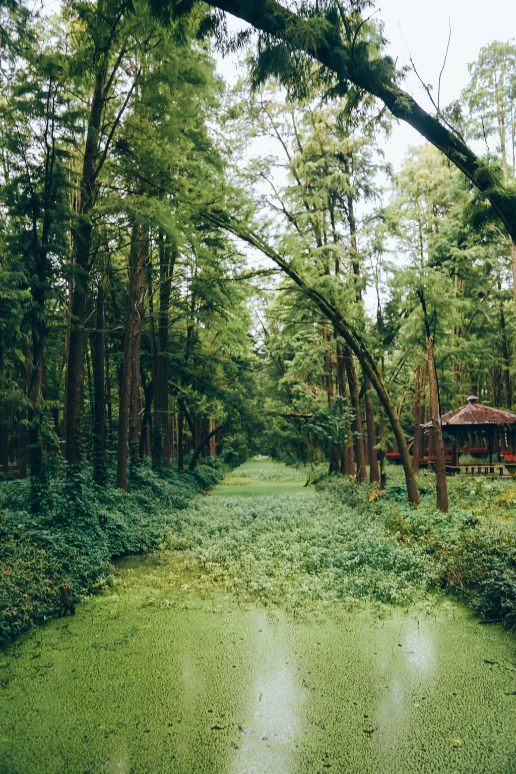 阳光透过树叶的缝隙,洒落在地面在水面,斑斑驳驳,这里无数的影子交织,水面也被一层绿意覆盖,远远望去没有尽头。