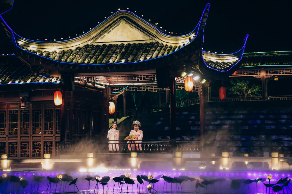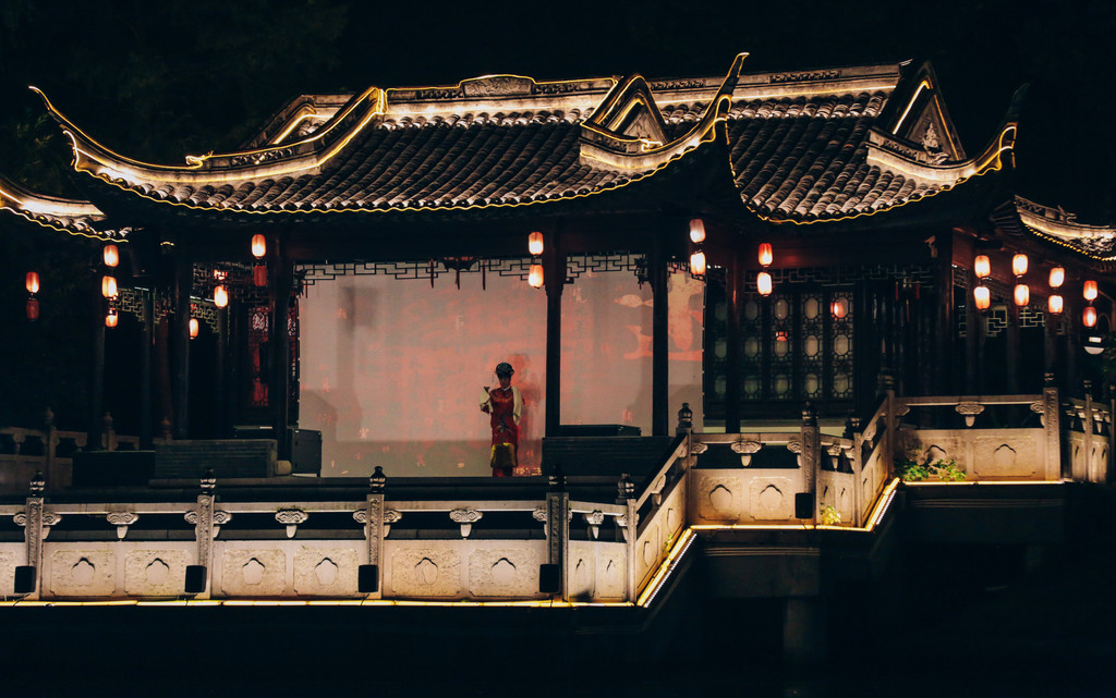 整个夜游会经过很多亭台石坊,会有不同的表演者为我们演奏不一样的戏剧。灯光迷离,烟雾飘渺,演唱者穿着行头,我们在船上飘飘荡荡。