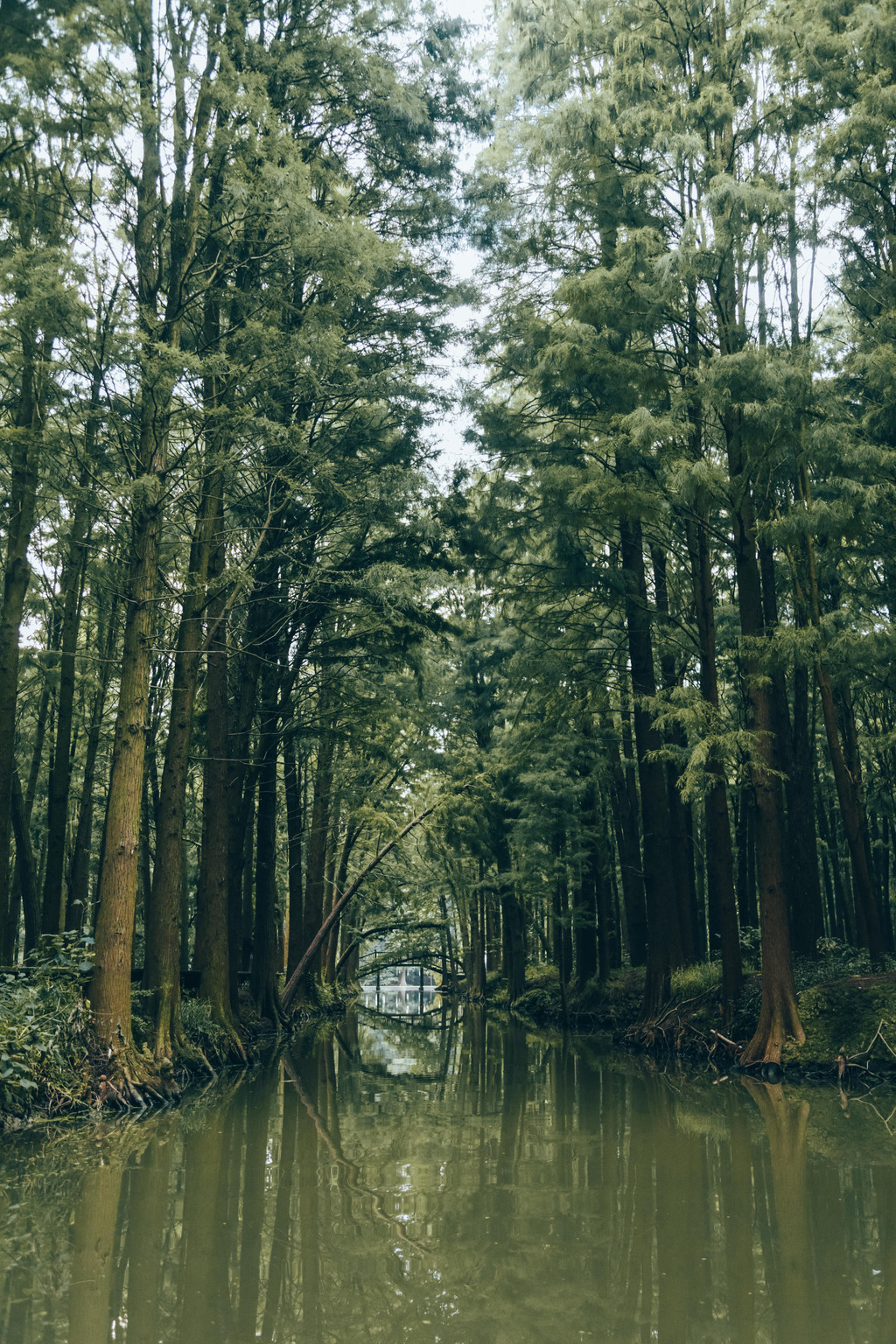 杉树耸立,河道清晰可见,如果这时再有一叶扁舟,就更加圆满了。