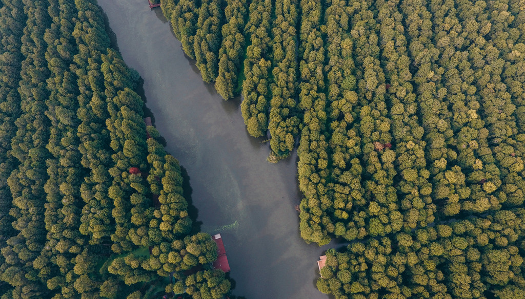 如今这里栽种的10万余株水杉、池杉等品种树木已长成高大茂密、生机盎然的水上园林。