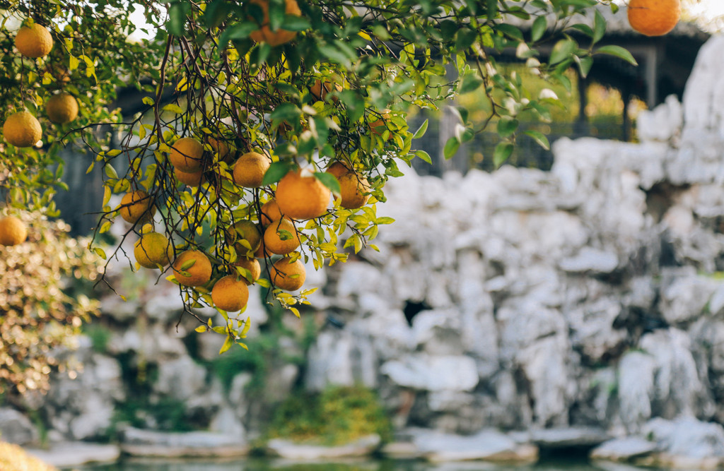 园中的果子成熟了,黄灿灿的挂在枝头,被阳光照耀着,惹人喜爱。