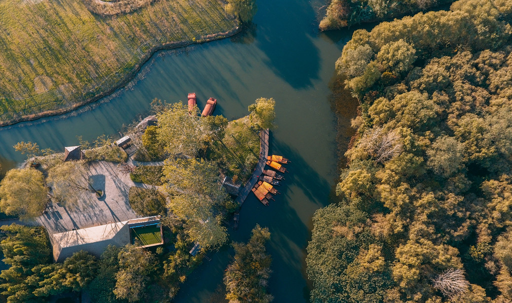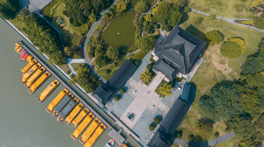空中的视角,树木在水面被拉长了身影,画舫停在码头,水面平静没有丝毫波澜,远方通透,阳光温柔。