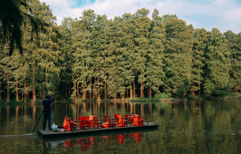 乘坐木筏,乘船人拿着长长的竹竿带着我们一起飘向丛林深处。这里水系丰富河道纵横,“河流回环、水杉林立”水乡美景尽数在眼前。