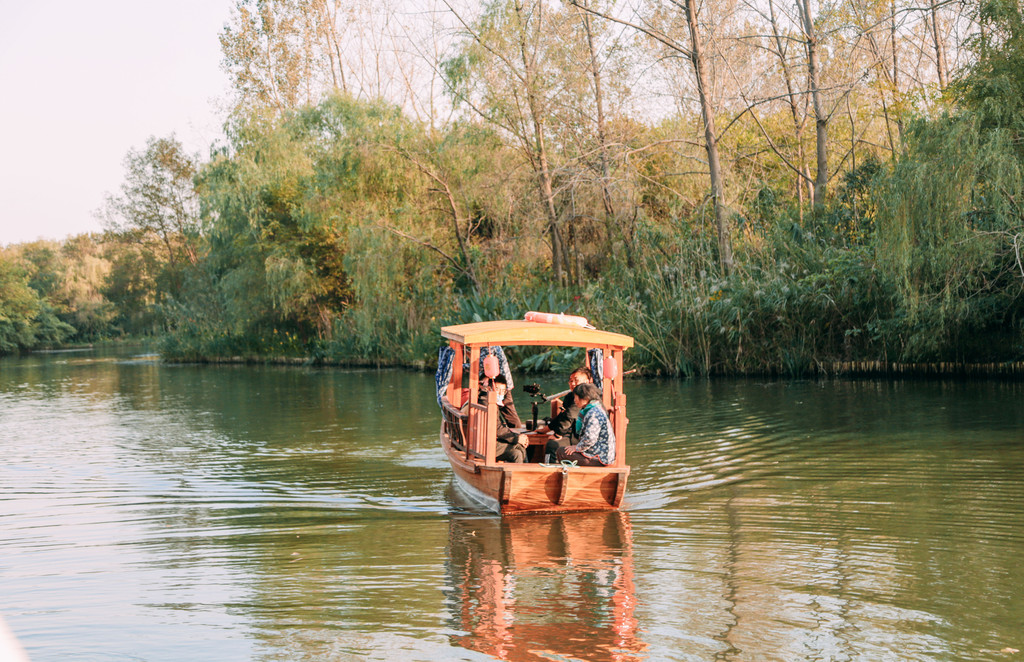 步行参观是一种风景,乘坐摇橹船则更有韵味,在船只的晃晃悠悠中,划破湖面驶向远方。