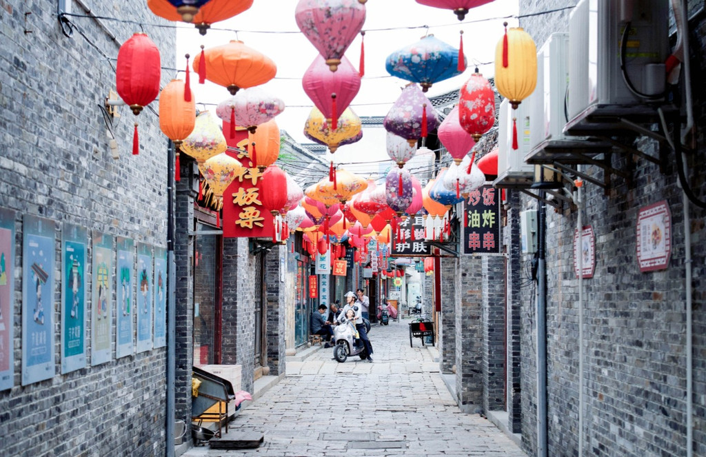 一条小巷里挂满了各种样式的灯笼,红橙黄蓝各色都有,很喜庆的感觉。