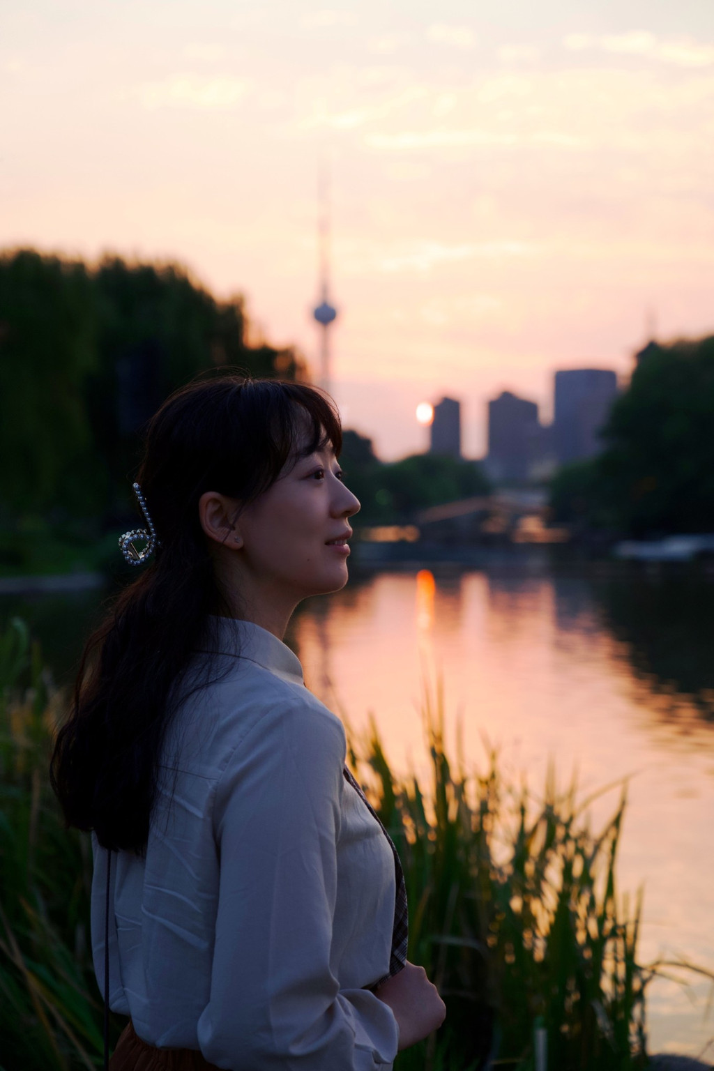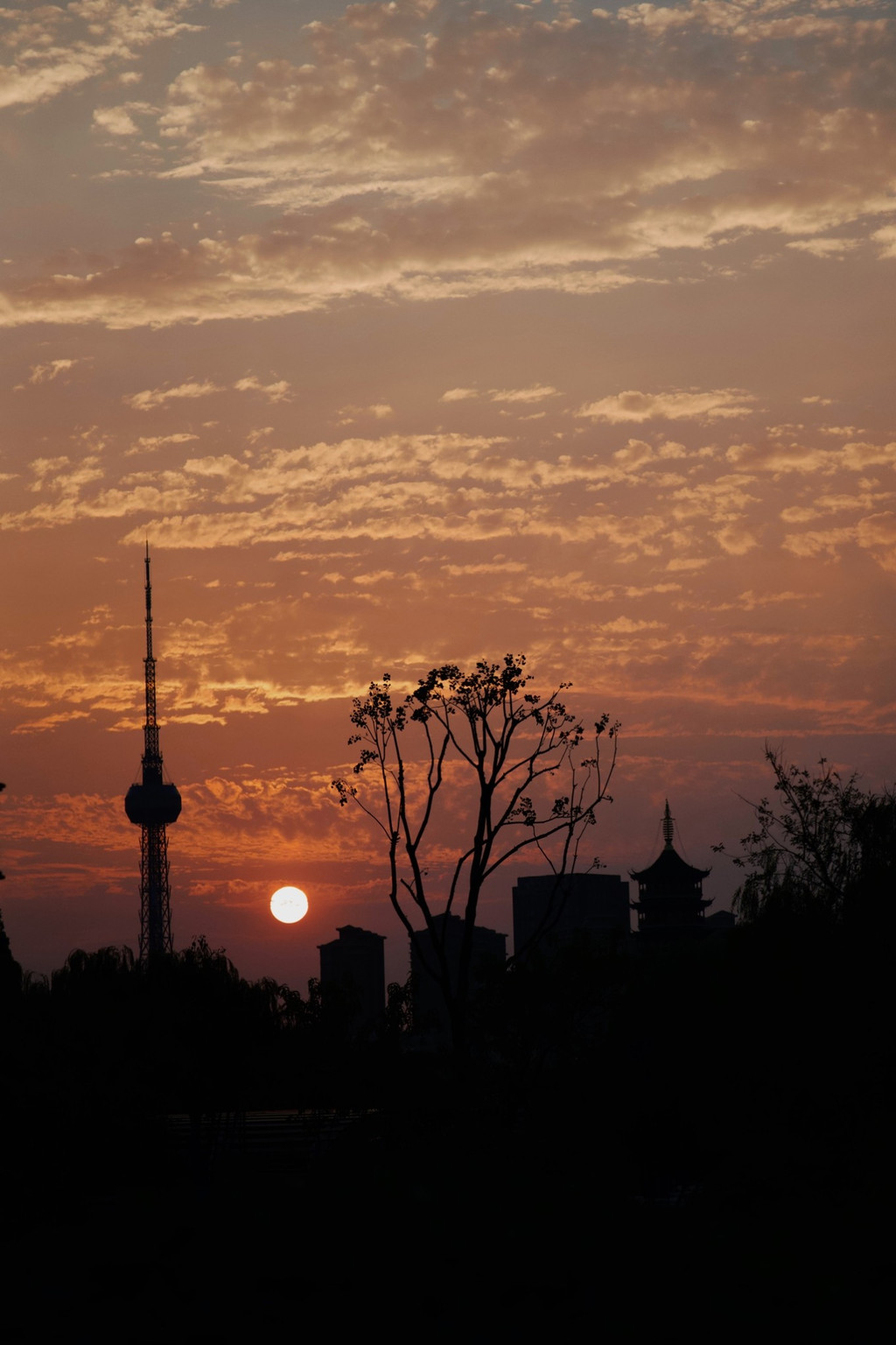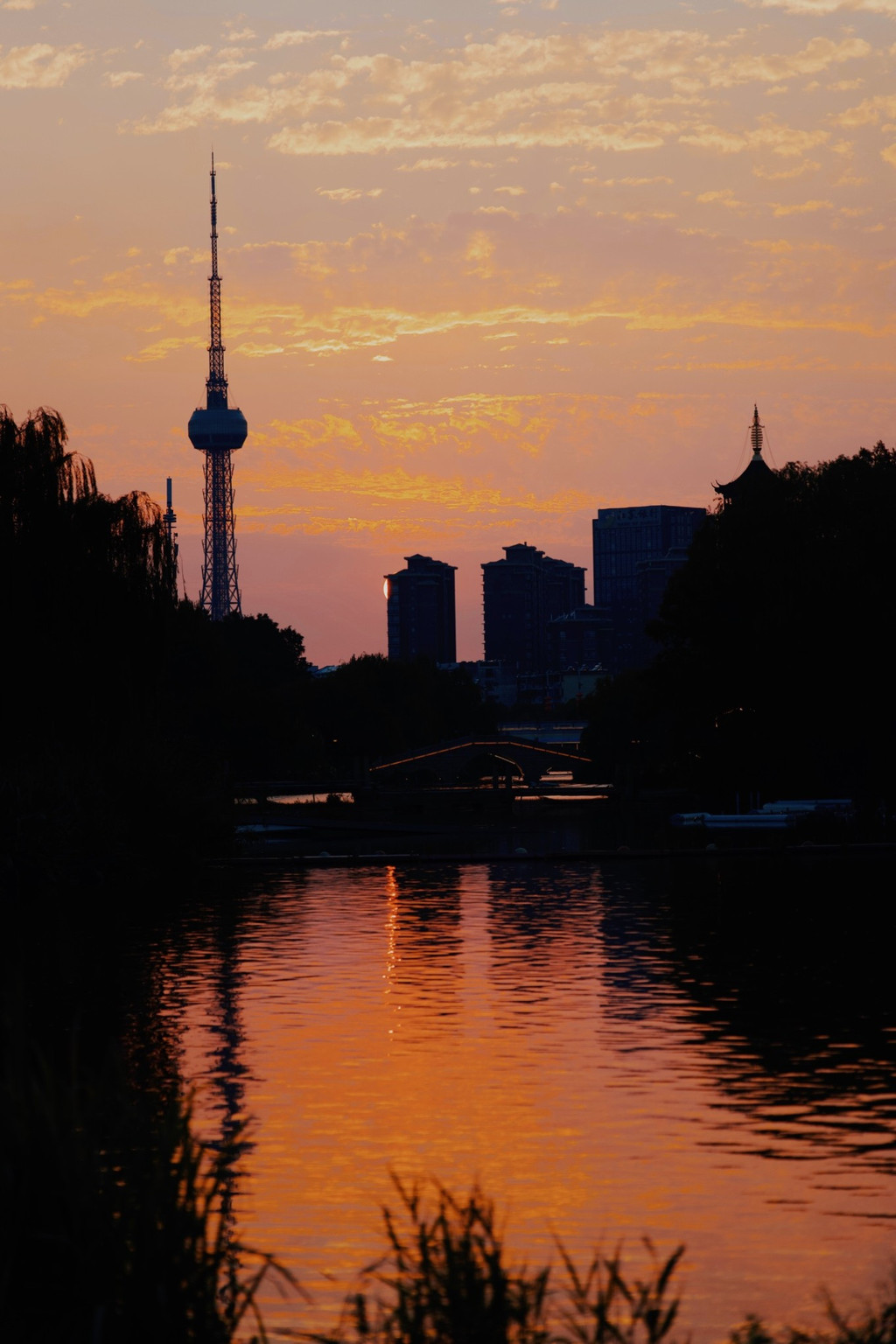 等到夕阳西下,橙红色开始渐渐染红天边,大大圆圆的太阳像鸭蛋黄一般。当天色愈暗,河道也被映满了橙色。