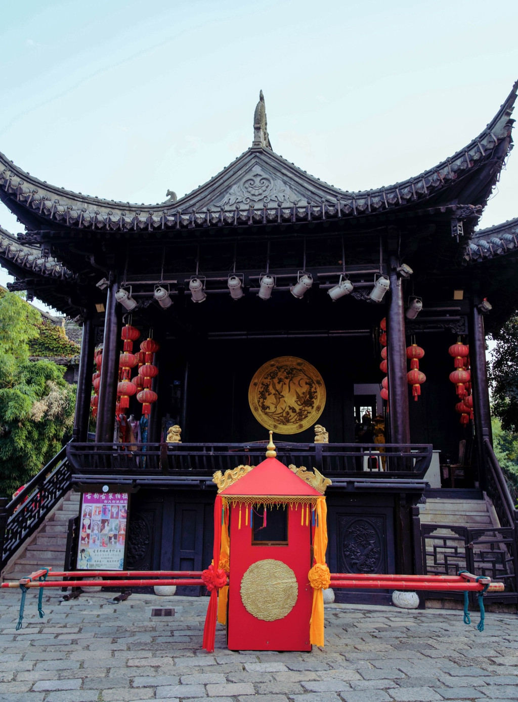 这里的逢年过节也会有一些表演。飞檐翘角雕梁画栋,古戏台和大花轿,还有在河中静静停着的小船,仿古的青石板道路。这个广场的景致布置花了很多的心思,身处其中确实好像回到了古时候。