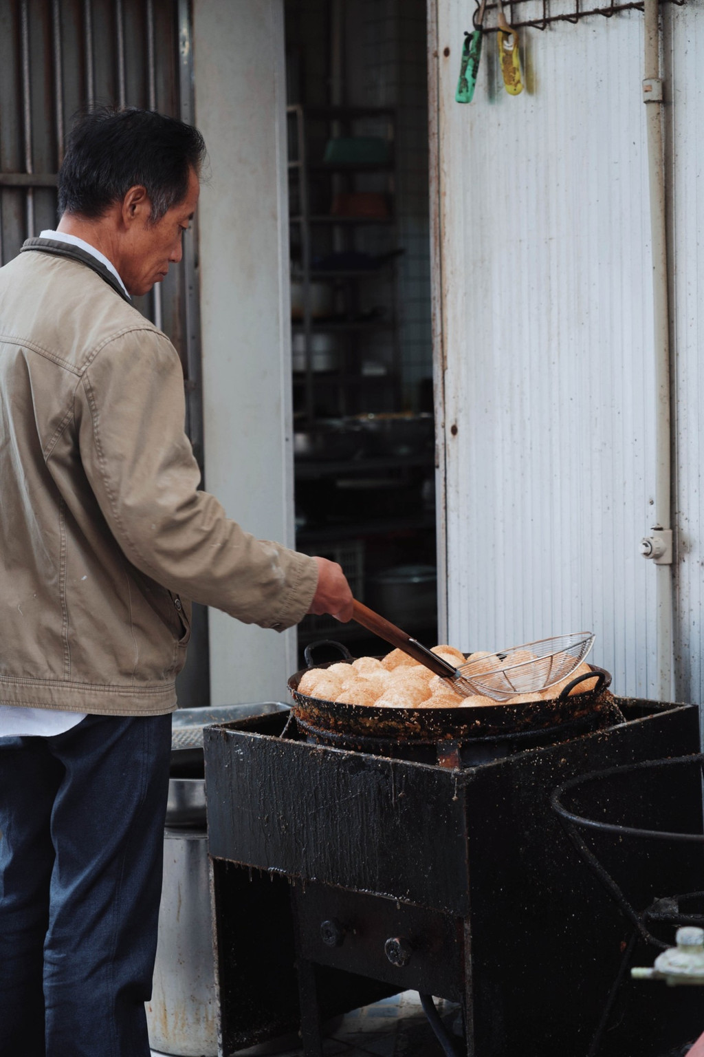 这些卖鱼圆鱼饼的店家,手速很快,一人吆喝一人炸,相互配合。鱼圆下锅后迅速膨胀飘浮起,等到金黄之后就可以出锅了。现做的鱼丸确实鲜美,QQ弹弹,太适合炒菜或者煲汤啦。
