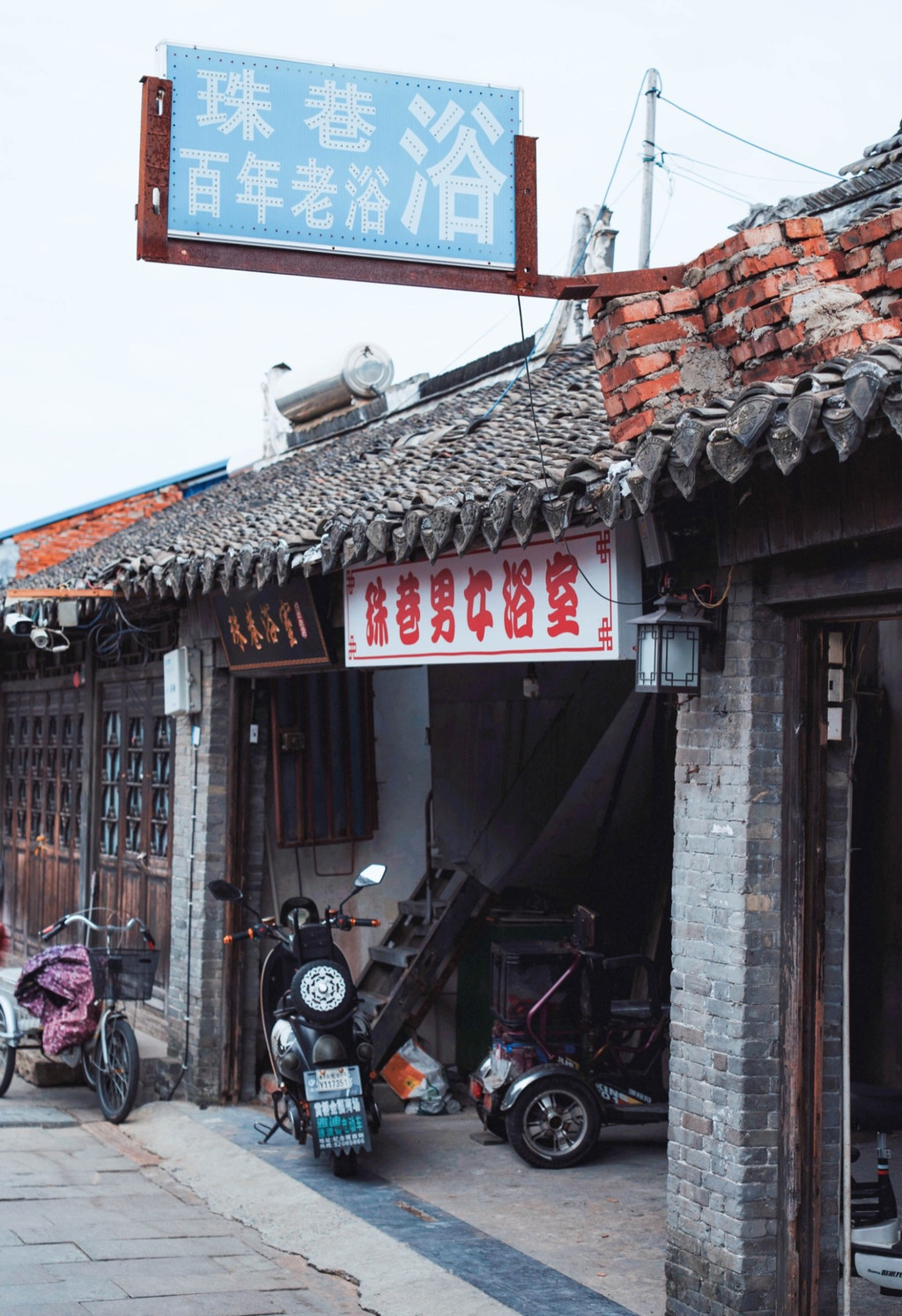 在黄桥古镇上,还有这样一间百年老浴。我不知道有多少人见过这样的大众浴室(可能北方会多一些),在不算大的房内,男女分开,各自带着洗护用品,有人结伴有人独行,一般下午傍晚来这里的人最多。