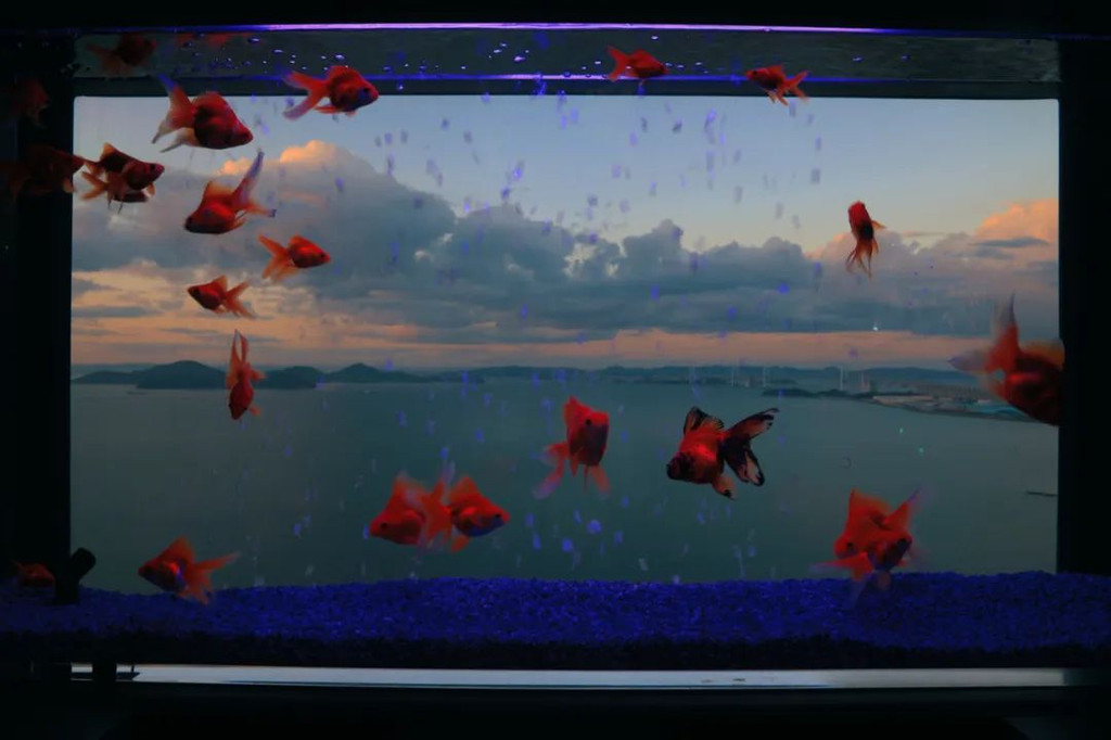 🐠3333条优雅的金鱼,在水族箱中自由游弋,又仿佛同时在濑户内海上空飞翔~~宇宙主题在5F(高127米处),金鱼和光影效果创造出炫目的异世界感;地球主题在4F,将植物与窗外的海和建筑等融合出治愈风的自然感。