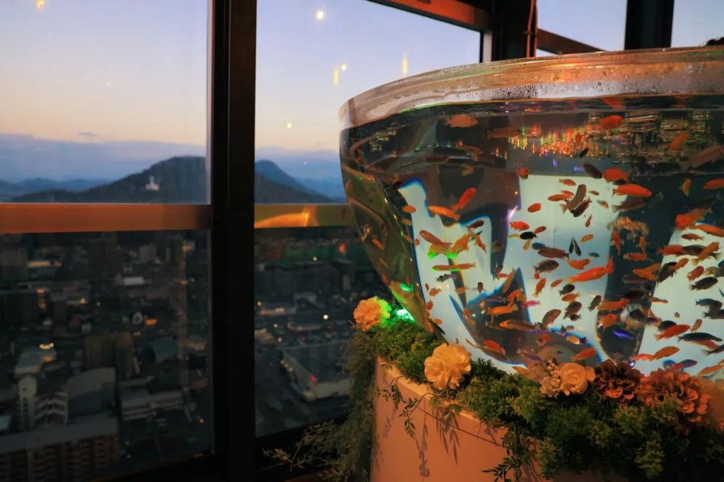 🌃到了香川,就静下心来欣赏一场濑户内海的夜景吧!在香川县西部的海边,伫立着一座“黄金塔”,在158米的塔顶顶层900平方米空间内,藏着一个色彩斑斓的热带鱼和水星球的和谐世界——SORAKIN空中水族馆,这里是世界上第一个“飞行金鱼水族馆”哦~~