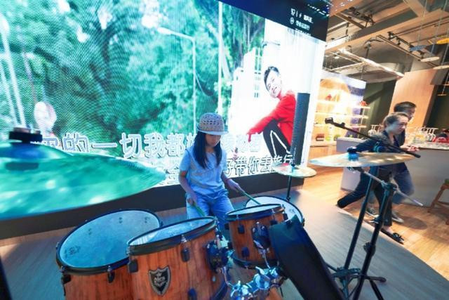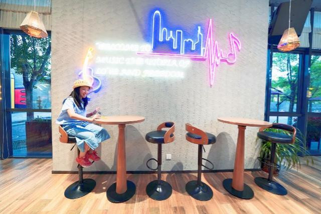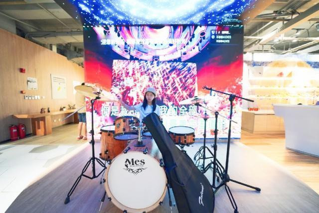 室内大气时尚,大大的电子显示屏幕上正唱着歌曲,前面摆放的架子鼓吸引了女儿,虽然不会敲架子鼓,但是摆拍一下一直耍耍帅还是要的。
