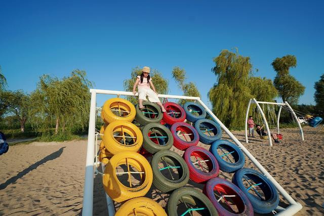 各种抓鱼儿玩法让孩子们开怀大笑,沙滩上的各种玩乐设施更是让孩子们放飞了自我。这样大的轮胎攀爬梯子让孩子进行了体能训练,坐在上面眺望大海,是最美好的时光。
