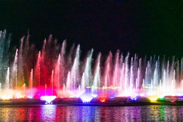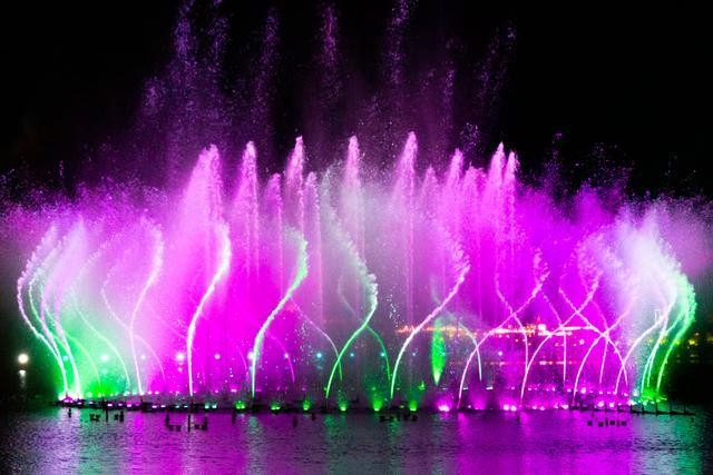 随着音乐声响起,南湖的水面热闹了起来,色彩与光影斑驳交融,映入眼前是变幻不定的美丽画面。