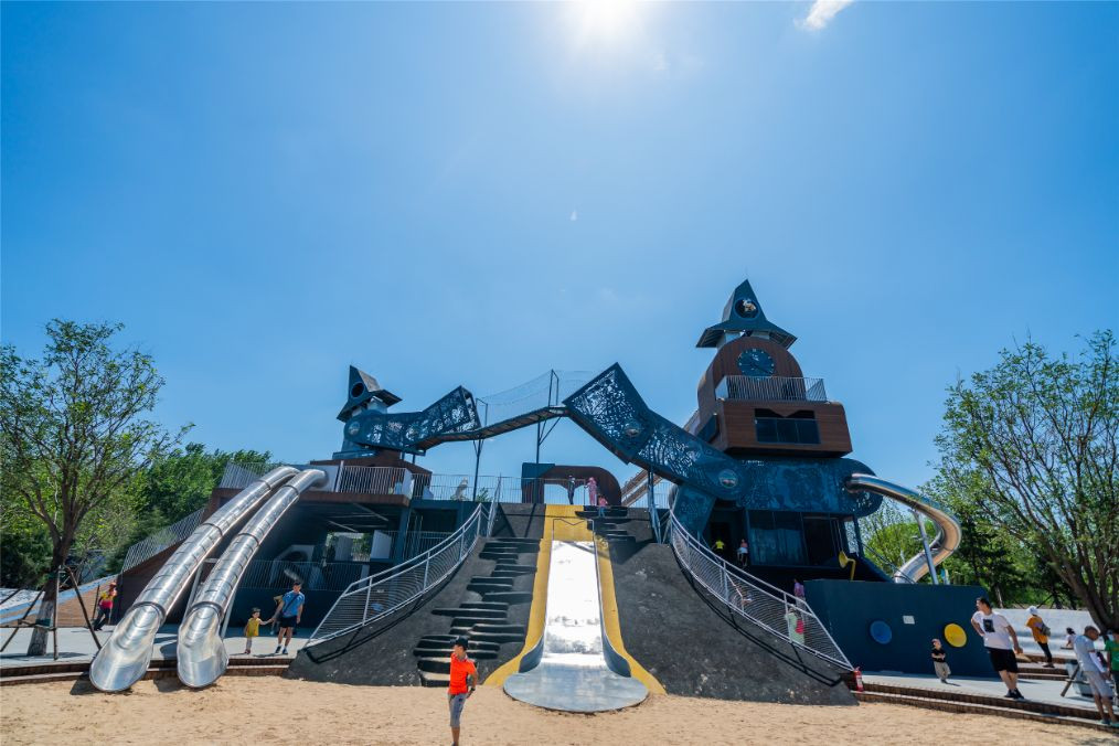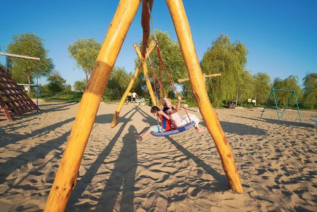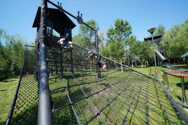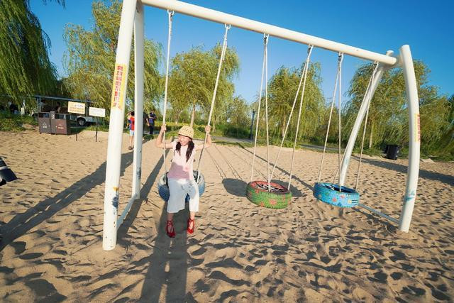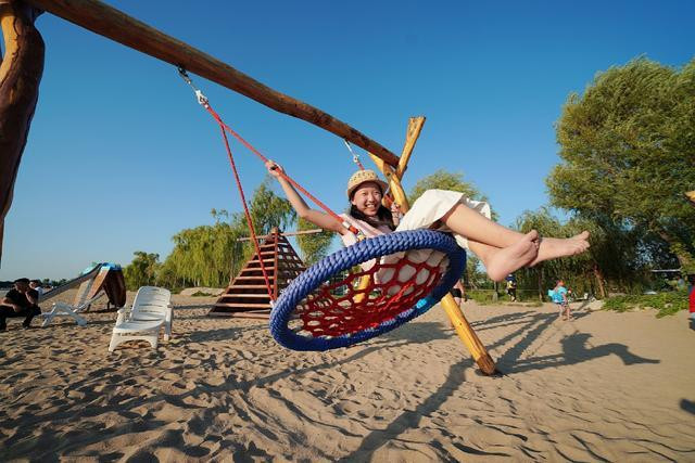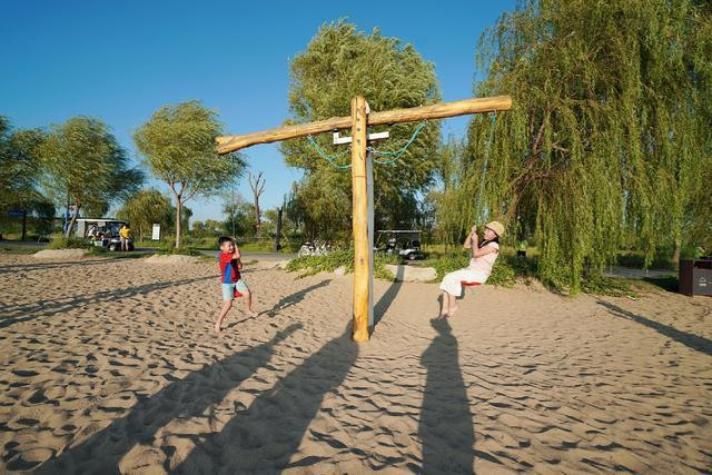 小朋友们荡起秋千,坐在网状的秋千内,欢笑声响满整个沙滩。各种游乐设施不仅孩子能玩,大人也能玩,每一种玩法都是体能的释放,更是智慧的增长。