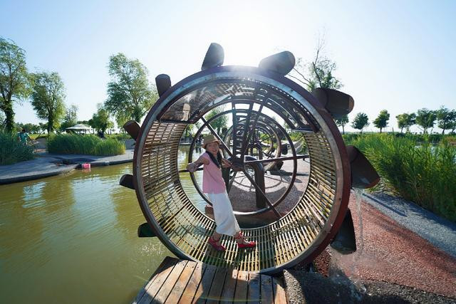 无论是风车还是水车,转动的都会让人心生欢喜,那是动力,是生产工具,这么大的水车想要转动起来怎么办?当然是人力来驱使啦,无论大人或孩子都可以站在里面踏步前行即可,这即告诉了孩子水车的作用,也增加了孩子对水车的认知,在水车内,每向前踏一步,水即会随着水车的转动而流出,转动越快,流动速度也越快,在玩耍的过程中也告诉了小朋友,付出的多,收获的才更多。